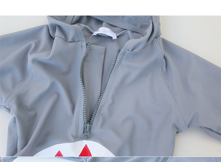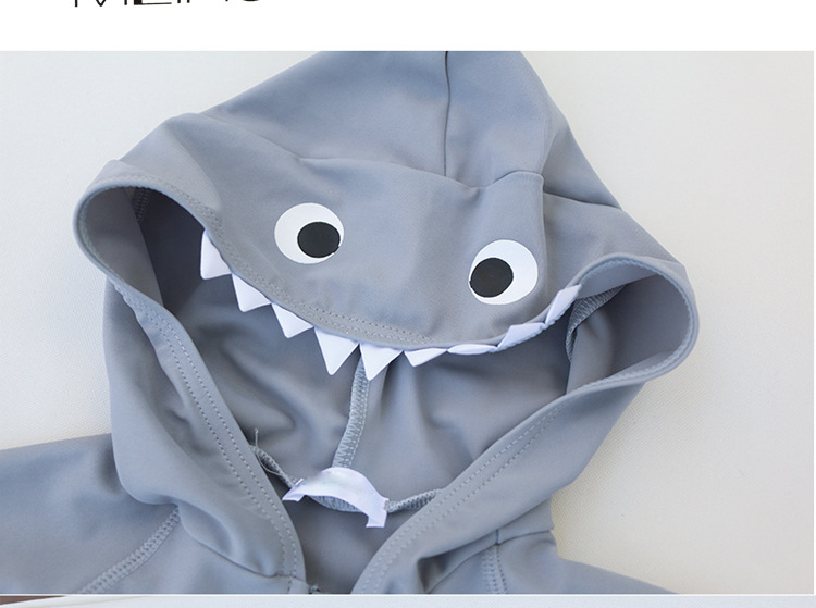 1. Đây là bộ trang phục có nón trùm, và em bé sẽ trông dễ thương như một con cá mập. Có khóa kéo trên ngực, thích hợp mặc đi bơi, suối nước nóng,