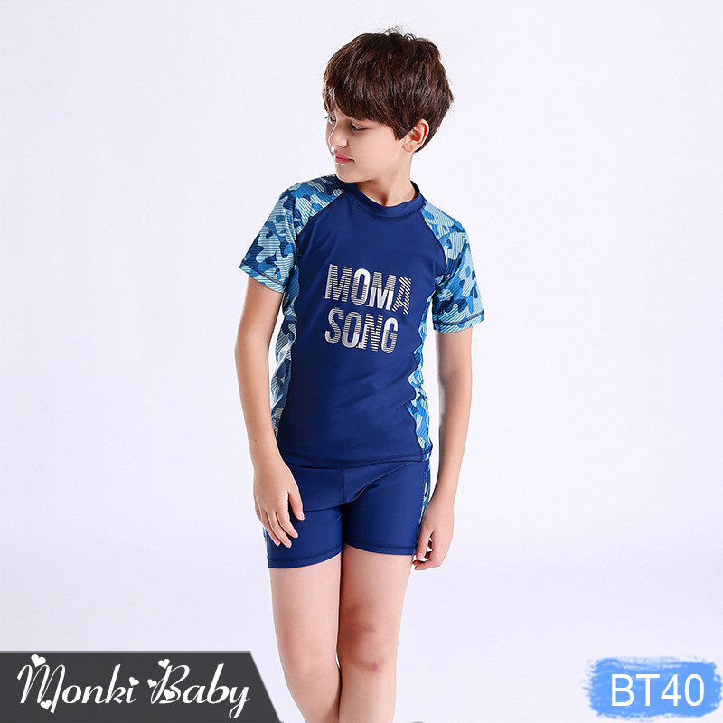 Thông số kỹ thuật Đồ bơi cho bé trai vừa và lớn size đại đến 55kg, mẫu thun bơi cao cấp, dáng áo cộc tay quần sooc đùi thể thao, có kèm mũ | BT40