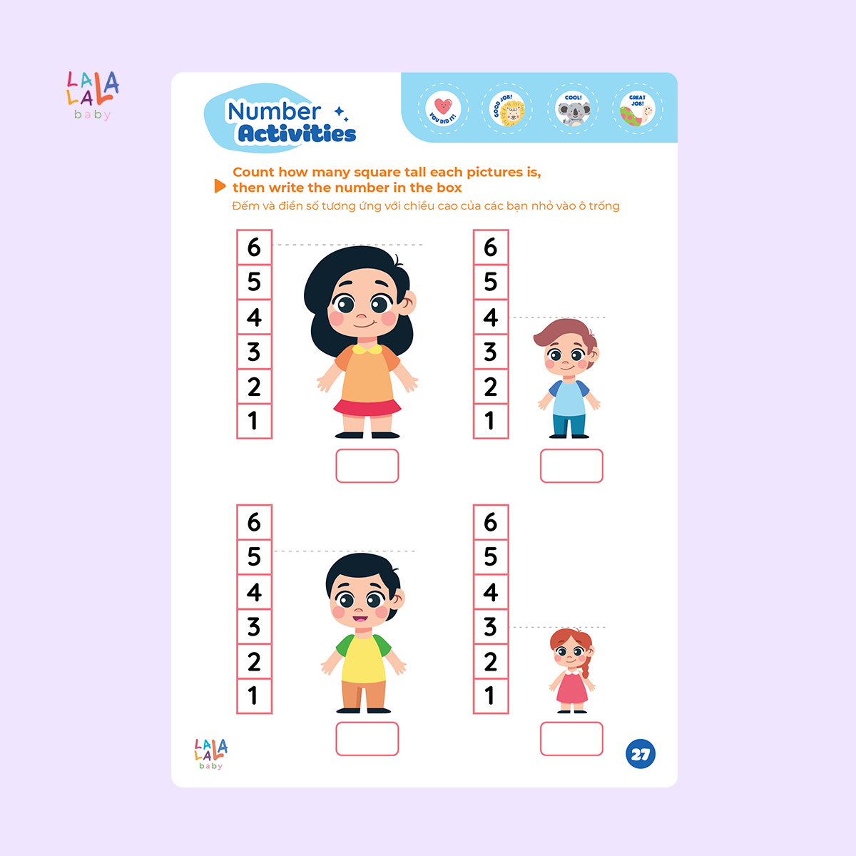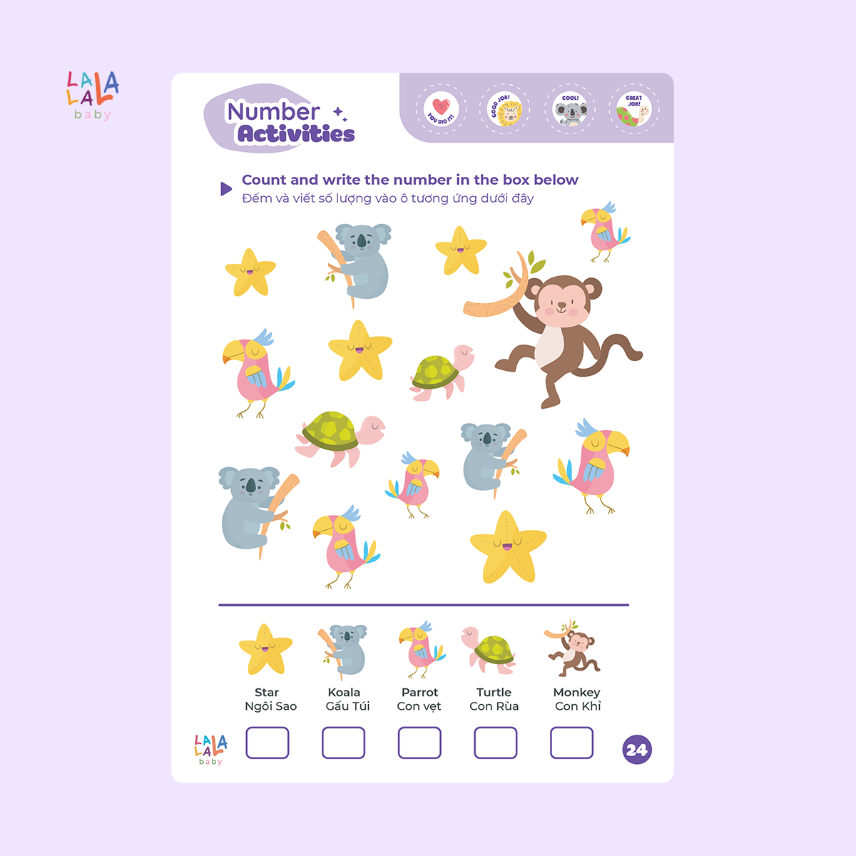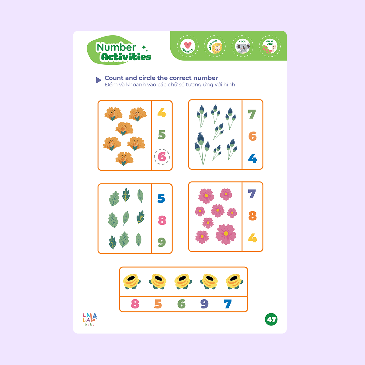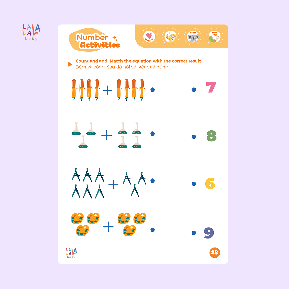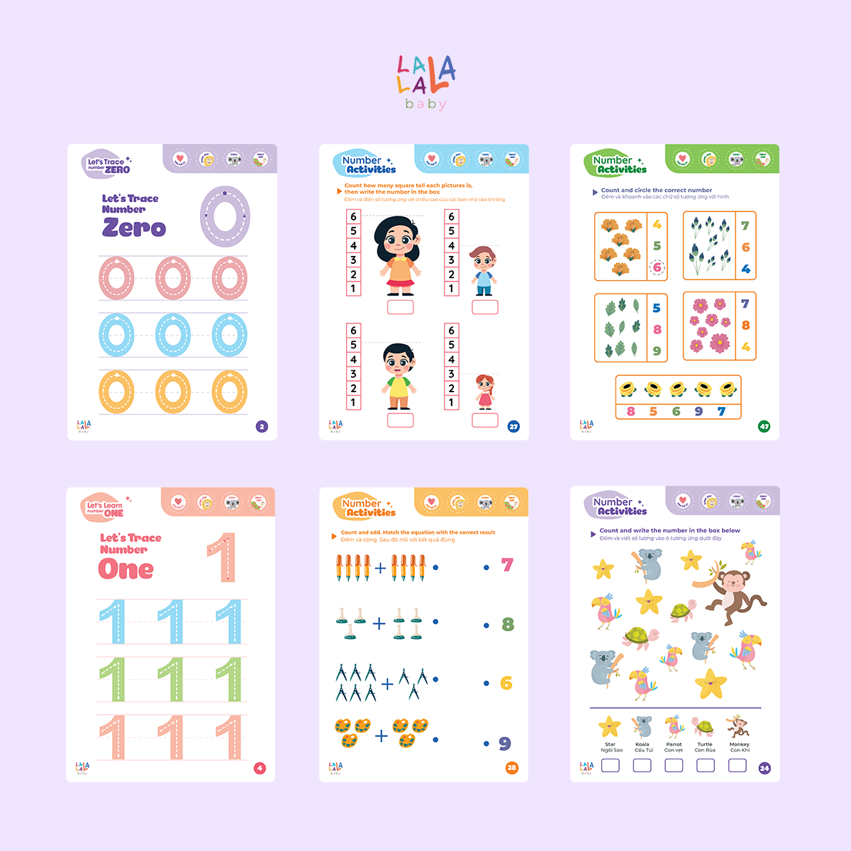 Hoàn thiện các số đếm, phép tính với hình ảnh minh họa sống động có phụ đề Tiếng Anh