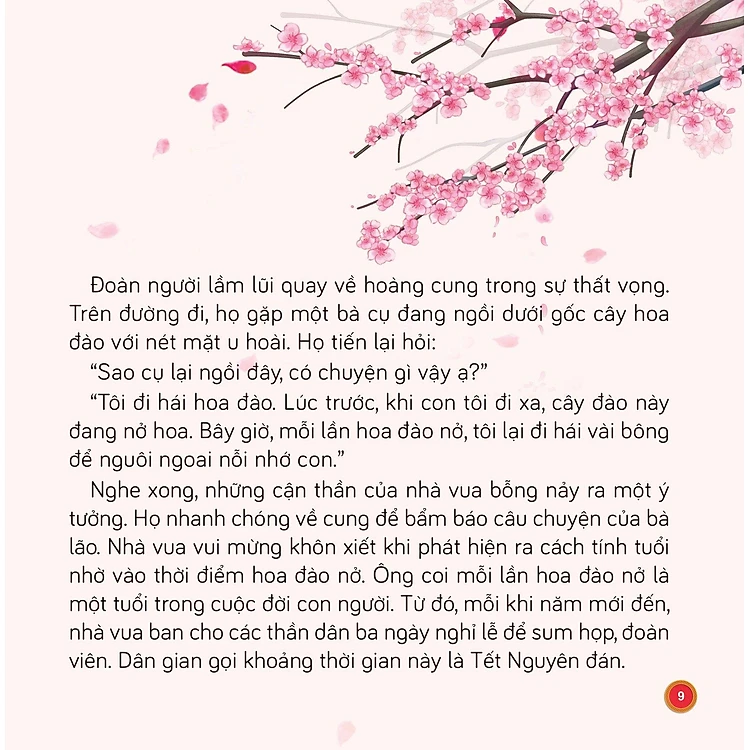- "Nghe xong, những cận thần của nhà vua bỗng nảy ra một ý tưởng. Họ nhanh chóng về cung để bẩm báo câu chuyện của bà lão. Nhà vua vui mừng khôn xiết khi phát hiện ra cách tính tuổi nhờ vào thời điểm hoa đào nở. Ông coi mỗi lần hoa đào nở là một tuổi trong cuộc đời con người. Từ đó, mỗi khi năm mới đến, nhà vua ban cho các thần dân ba ngày nghỉ lễ để sum họp, đoàn viên. Dân gian gọi khoảng thời gian này là Tết Nguyên đán.