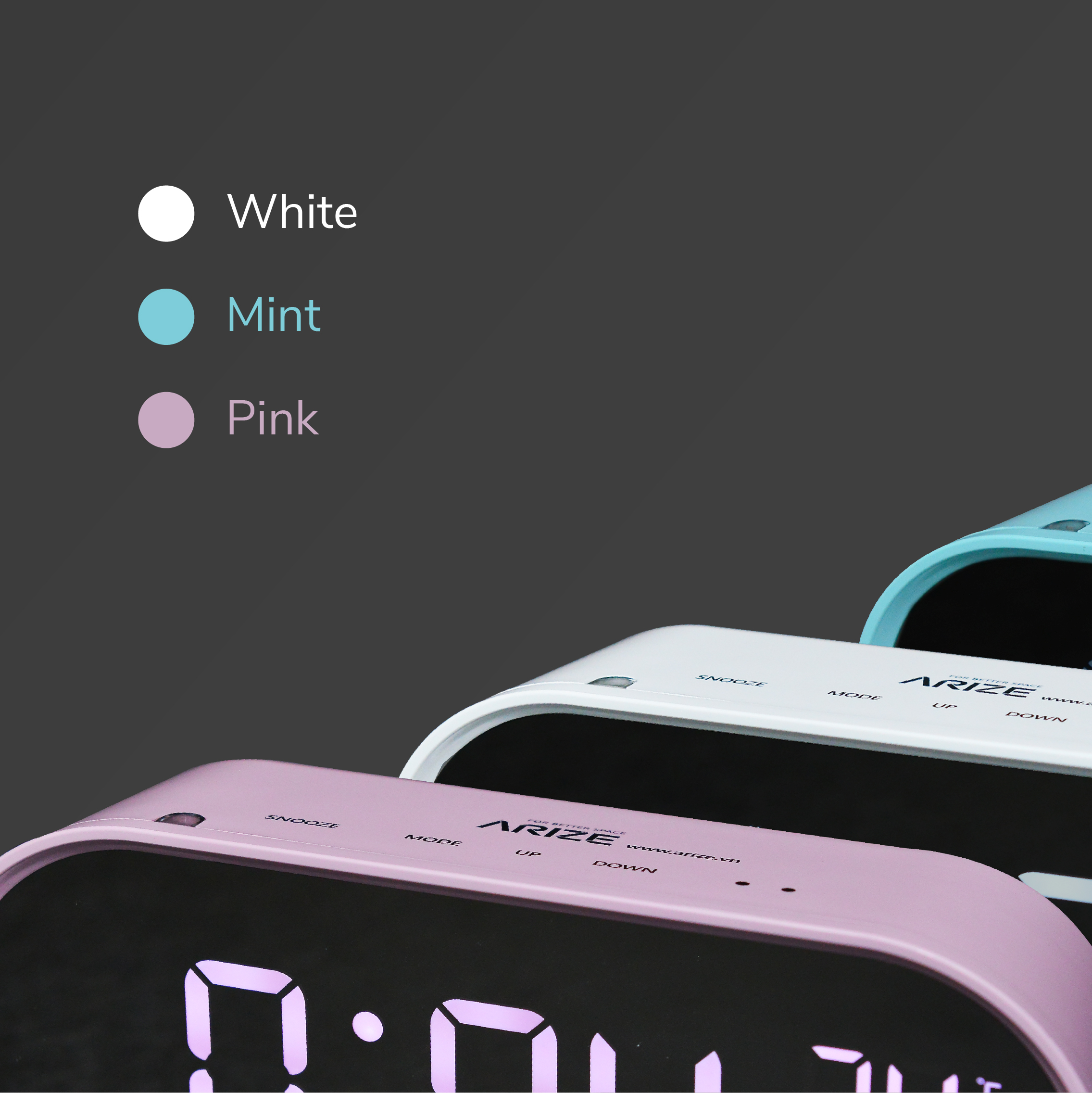 - BANDIZ Mirror Digital Desk Clock hiện có ba màu sắc Trắng, Hồng và Xanh dễ dàng kết hợp với nhiều không gian và phong cách nội thất khác nhau.
