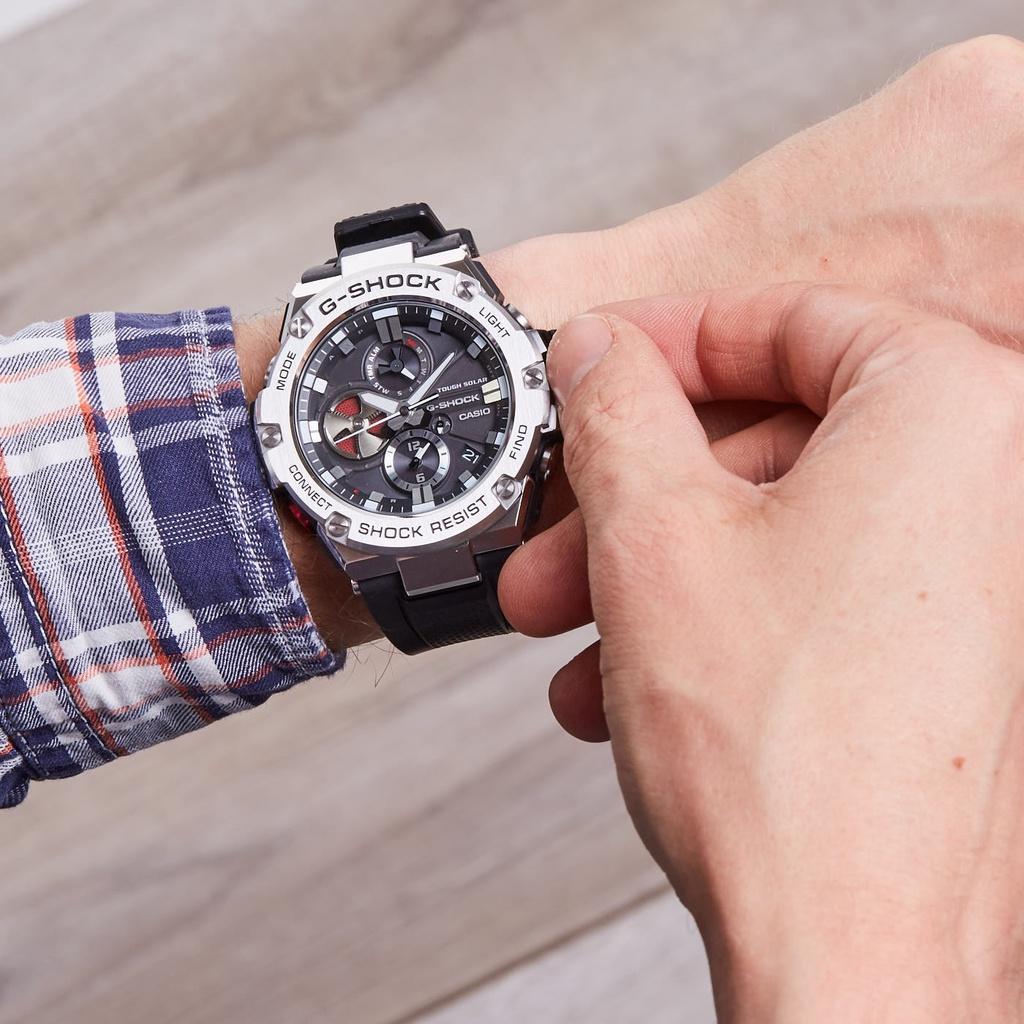 GST-B100-1A được trang bị Bluetooth cho phép thiết bị kết nối với điện thoại thông minh khi bấm nút ở vị trí 3h giúp tải thông tin về thời gian từ máy chủ qua internet. Nhờ đó, bạn có thể xem giờ hiện hành chính xác dù ở bất kỳ đâu trên thế giới.