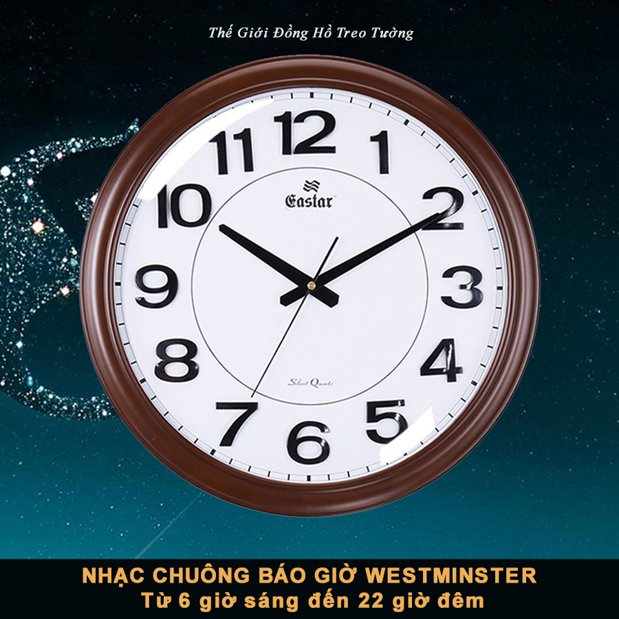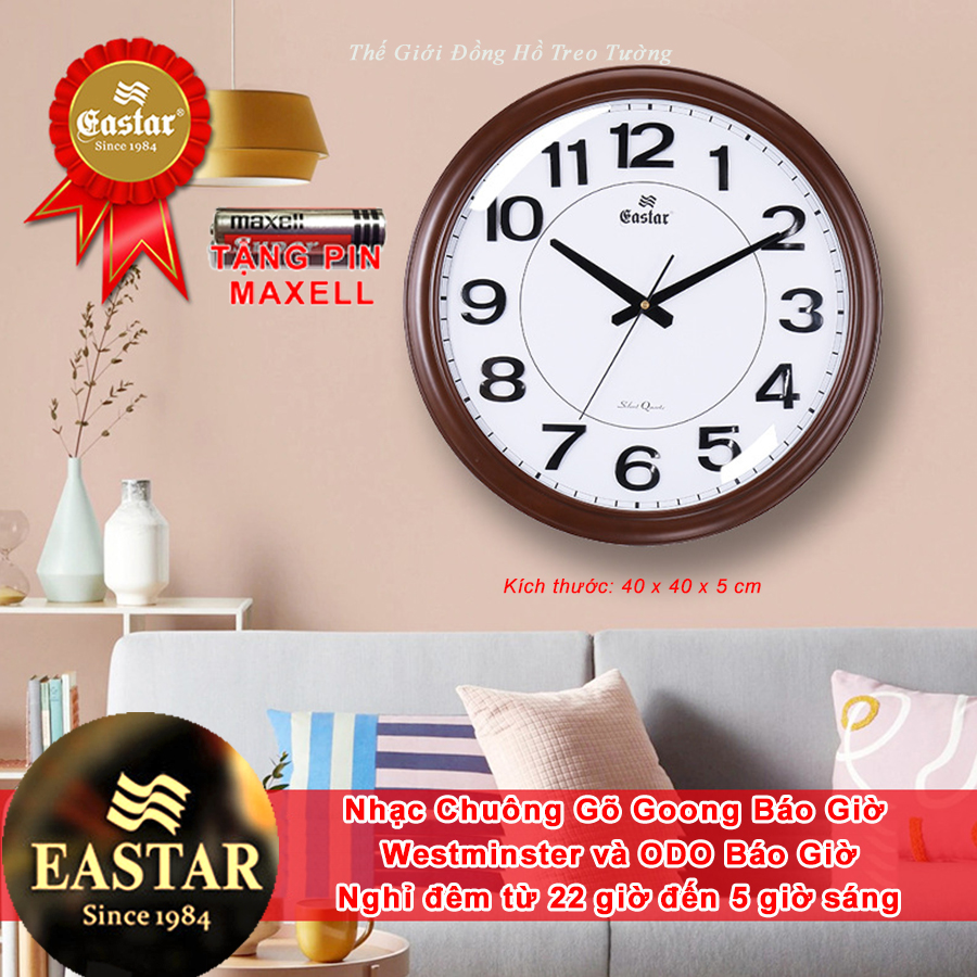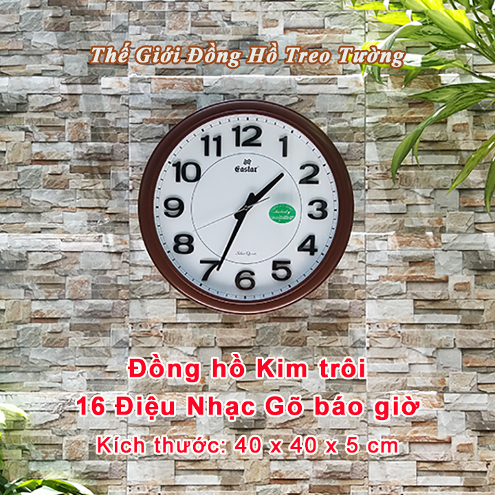- Đồng hồ EASTAR KIM TRÔI NHẬT hình tròn đường kính 40 cm, bộ số dập nổi trên nền hoa văn nhìn rất sang trọng, hiện đại, phù hợp treo nơi phòng khách hoặc không gian lớn.