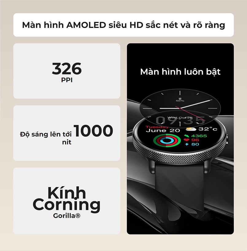 ️Màn hình cảm ứng AMOLED lớn 1.43 inch, độ phân giải 466 x 466, mang đến cho người dùng hình ảnh sắc nét, sống động.