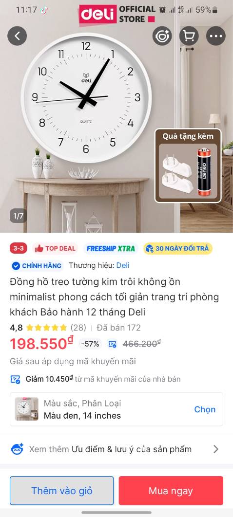 Thông số kỹ thuật Đồng hồ treo tường kim trôi không ồn minimalist phong cách tối giản trang trí phòng khách Bảo hành 12 tháng Deli