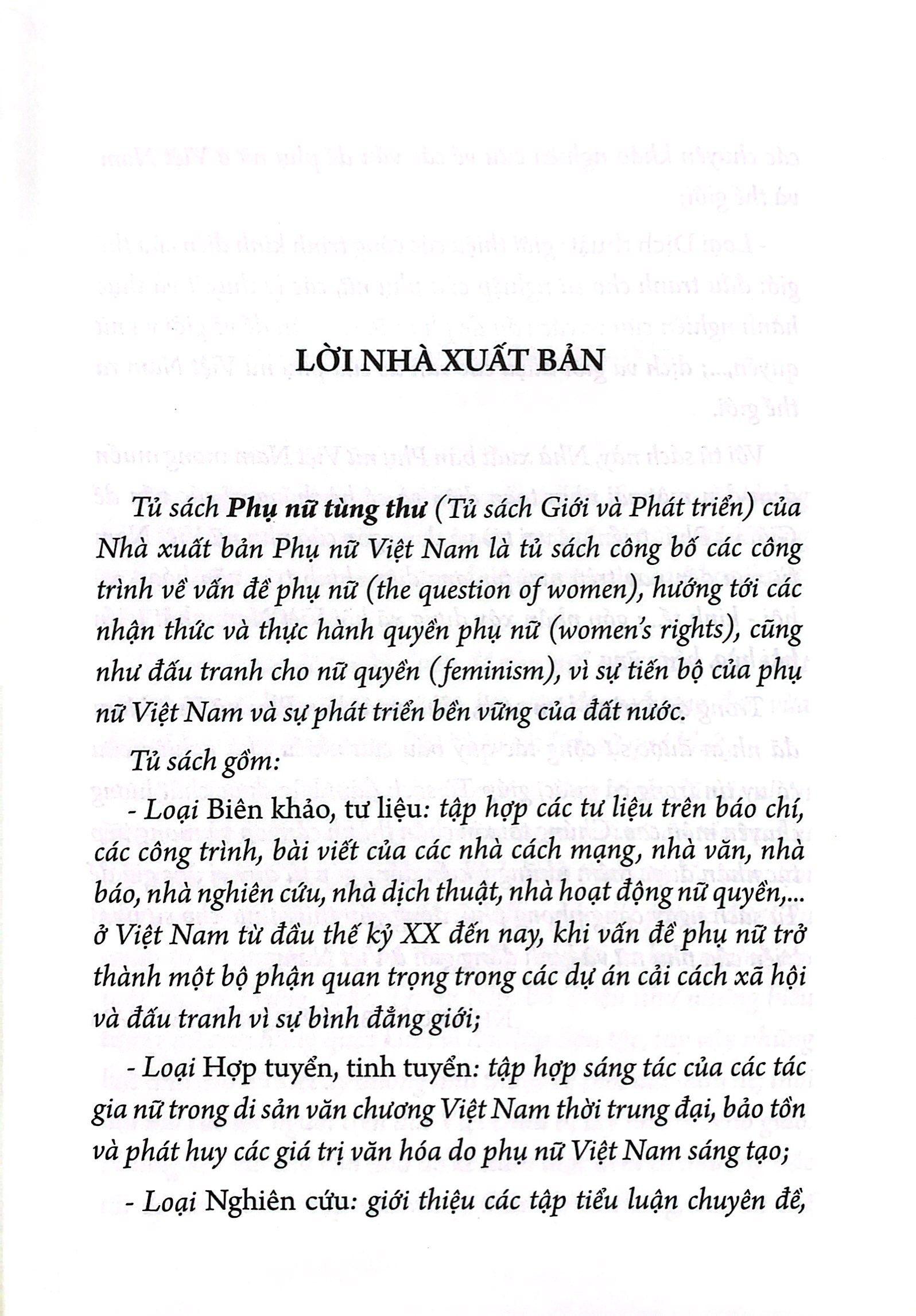 Với tủ sách này, Nhà xuất bản Phụ nữ mong muốn đem đến một cái nhìn toàn diện và có hệ thống về các vấn đề Giới và Phát triển; về vai trò và đóng góp của phụ nữ Việt Nam từ xưa đến nay trên mọi phương diện chính trị - văn hóa - xã hội - kinh tế; góp phần xây dựng xã hội Việt Nam phát triển hài hòa, bền vững.