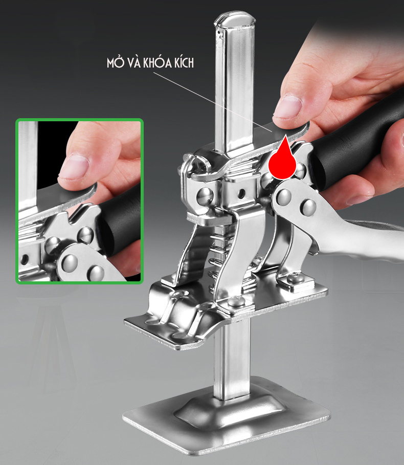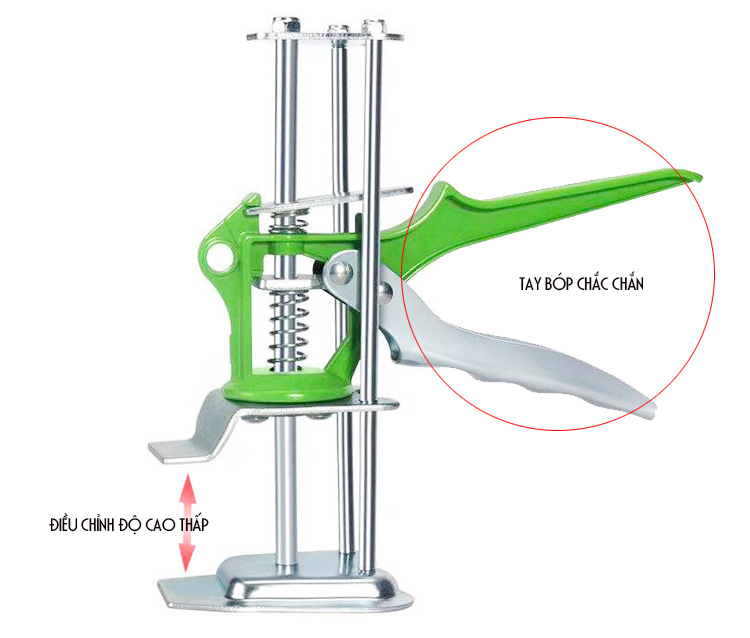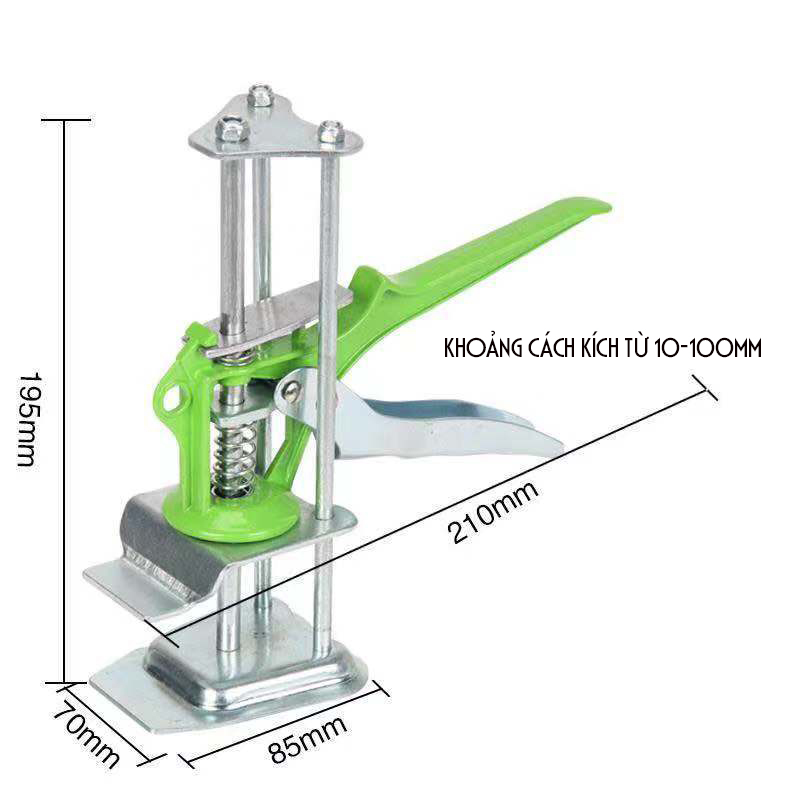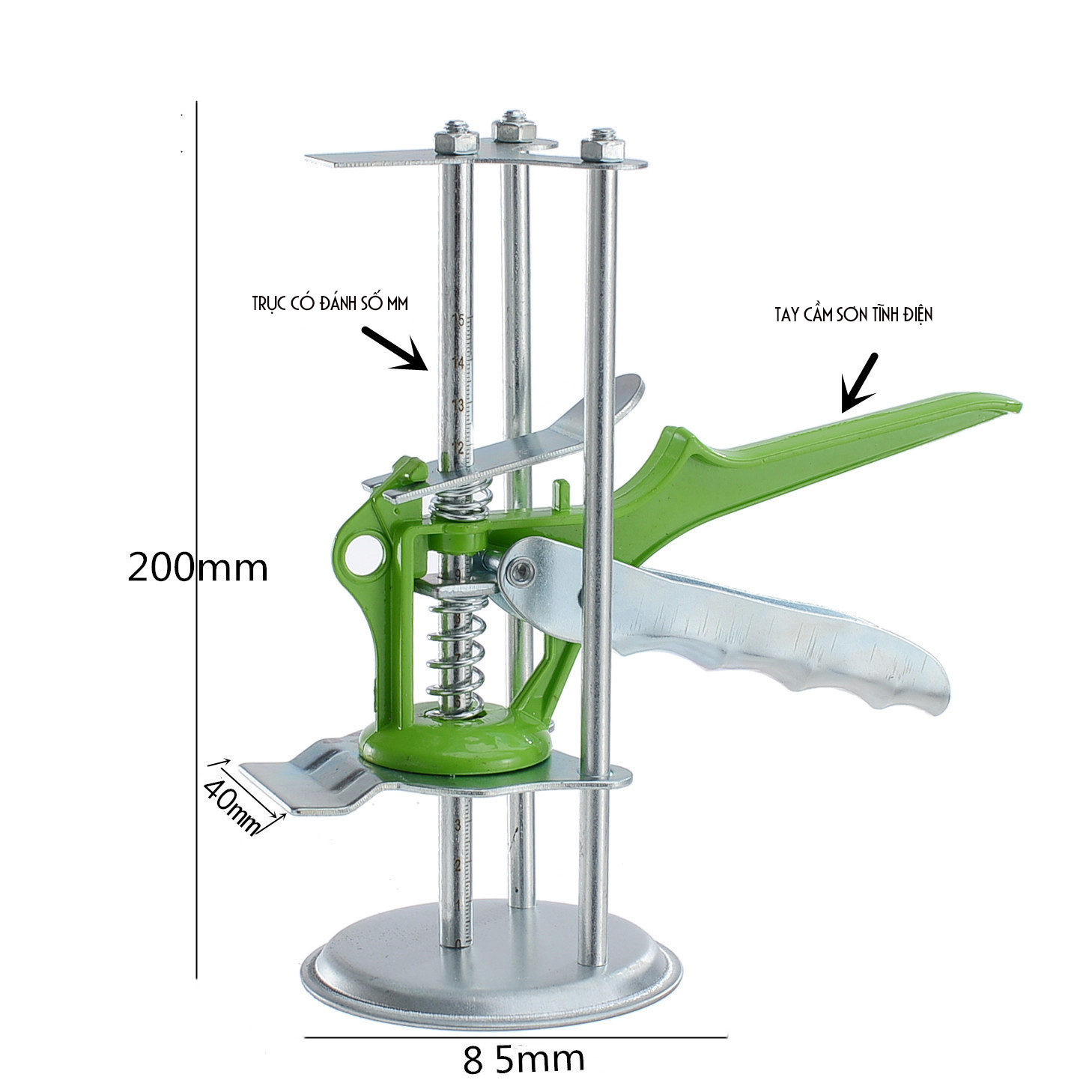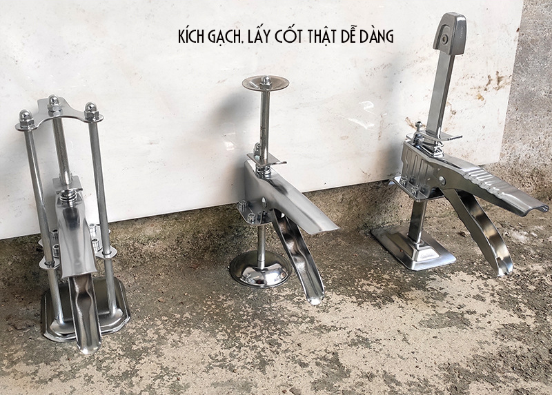 Sản phẩm lấy cốt gạch ốp tường bóp tay Với cách lấy cốt gạch truyền thống như kê kích gạch, chống gạch ốp tường thường sẽ gây ra những sai lệch trong khâu hoàn thiện nhà và mất đi tính thẩm mỹ.Những với sản phẩm lấy cos gạch ốp tường bóp tay thì chúng ta có thể hoàn toàn yên tâm,chúng ta chỉ việc đặt gạch lên gá đỡ và bóp tay đến cos mong muốn. Sản phẩm có thể đẩy cả hàng gạch lên, kích tối đa 85kg/ 1 kích, với viên gạch dài hay tấm đá lớn, dài ta dùng thêm kích.
