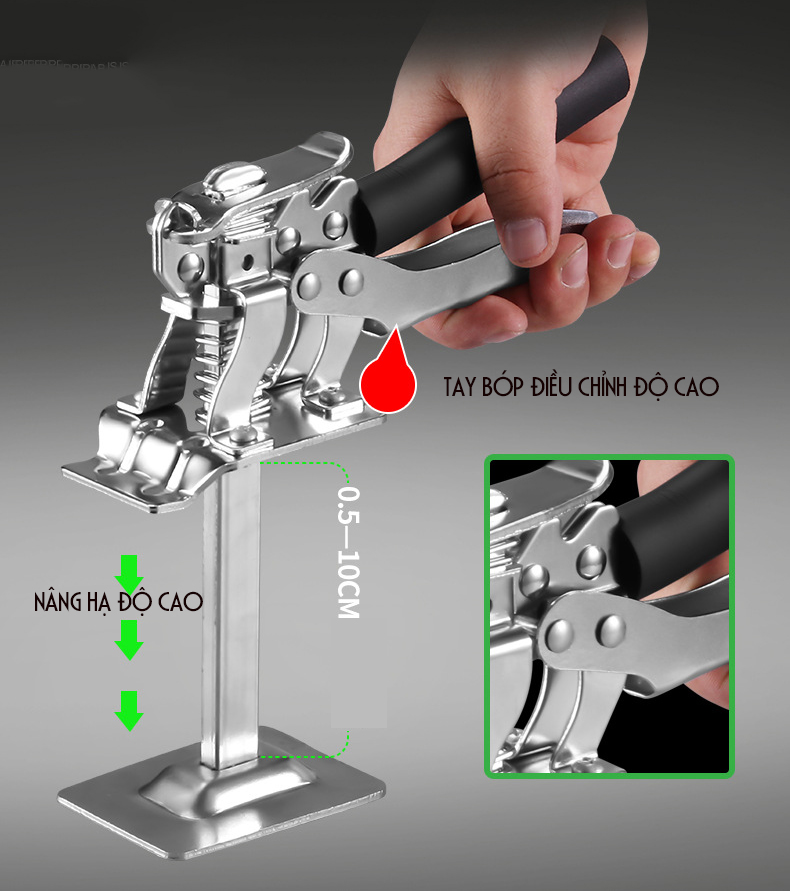 Chiều cao tối thiểu đưa dụng cụ lấy cos : 10mm và Chiều cao tối đa kích gạch: 500mm tùy loại