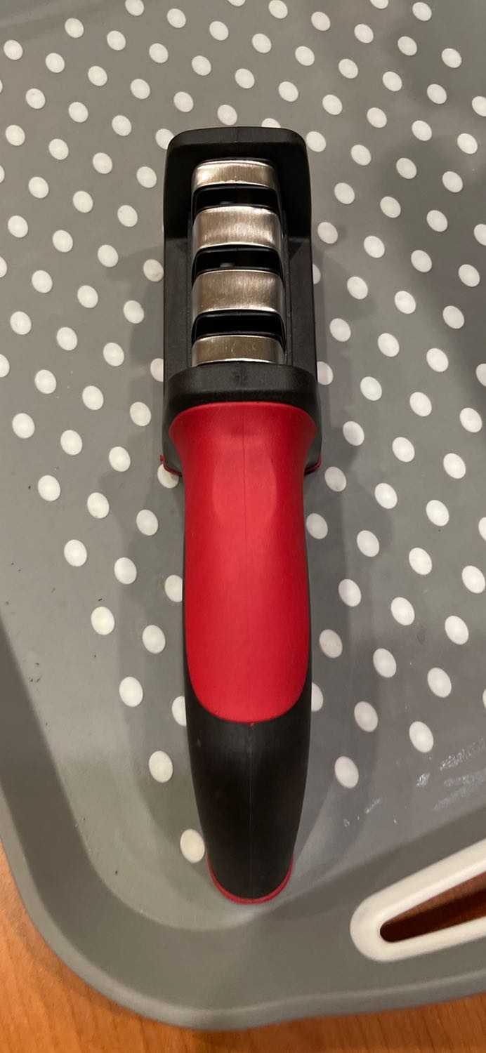 Dụng cụ này khá là nhỏ gọn, có thể cầm tay dễ dàng. Phần đế thiết kế chống trượt. Khi cần mài những con dao lớn, dao chặt, các mẹ hãy đặt xuống mặt bàn để mài nhé. Còn những con dao nhỏ hoặc kéo thì có thể cầm trên tay để mài. An toàn tuyệt đối nhé, ko sợ trượt, ko lo đứt tay khi mài.