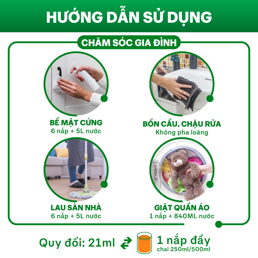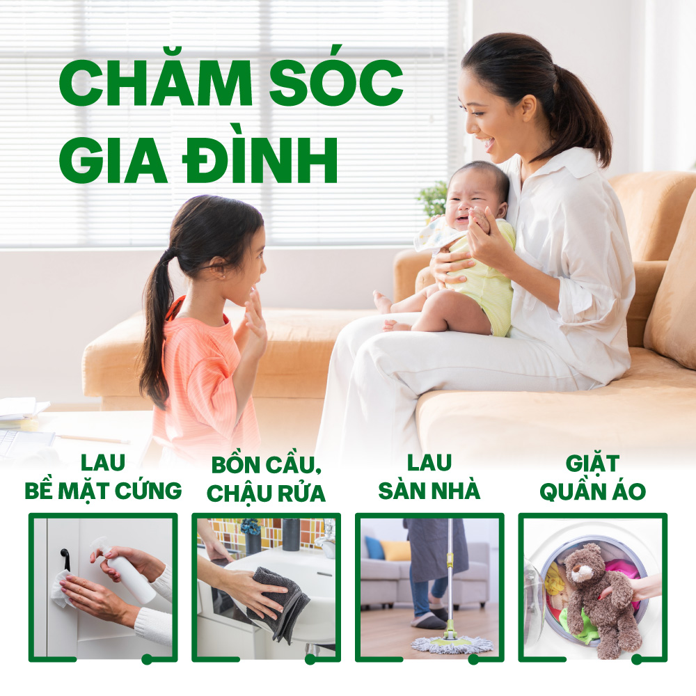 - Vệ sinh đồ dùng gia đình: Giặt giũ; Vệ sinh sàn nhà và các bề mặt cứng khác; Vệ sinh bồn cầu, chậu rửa (không acrylic), cống,…