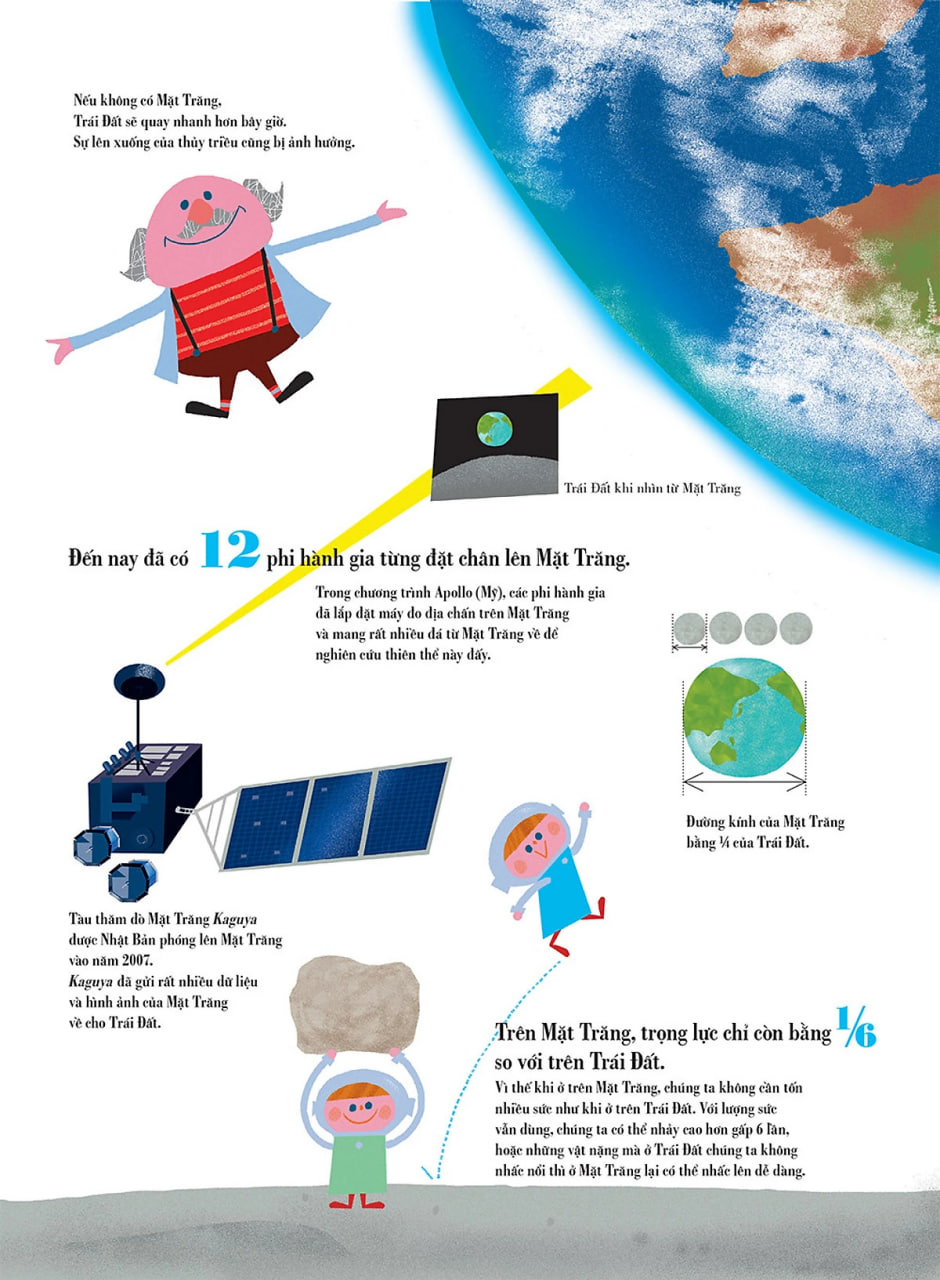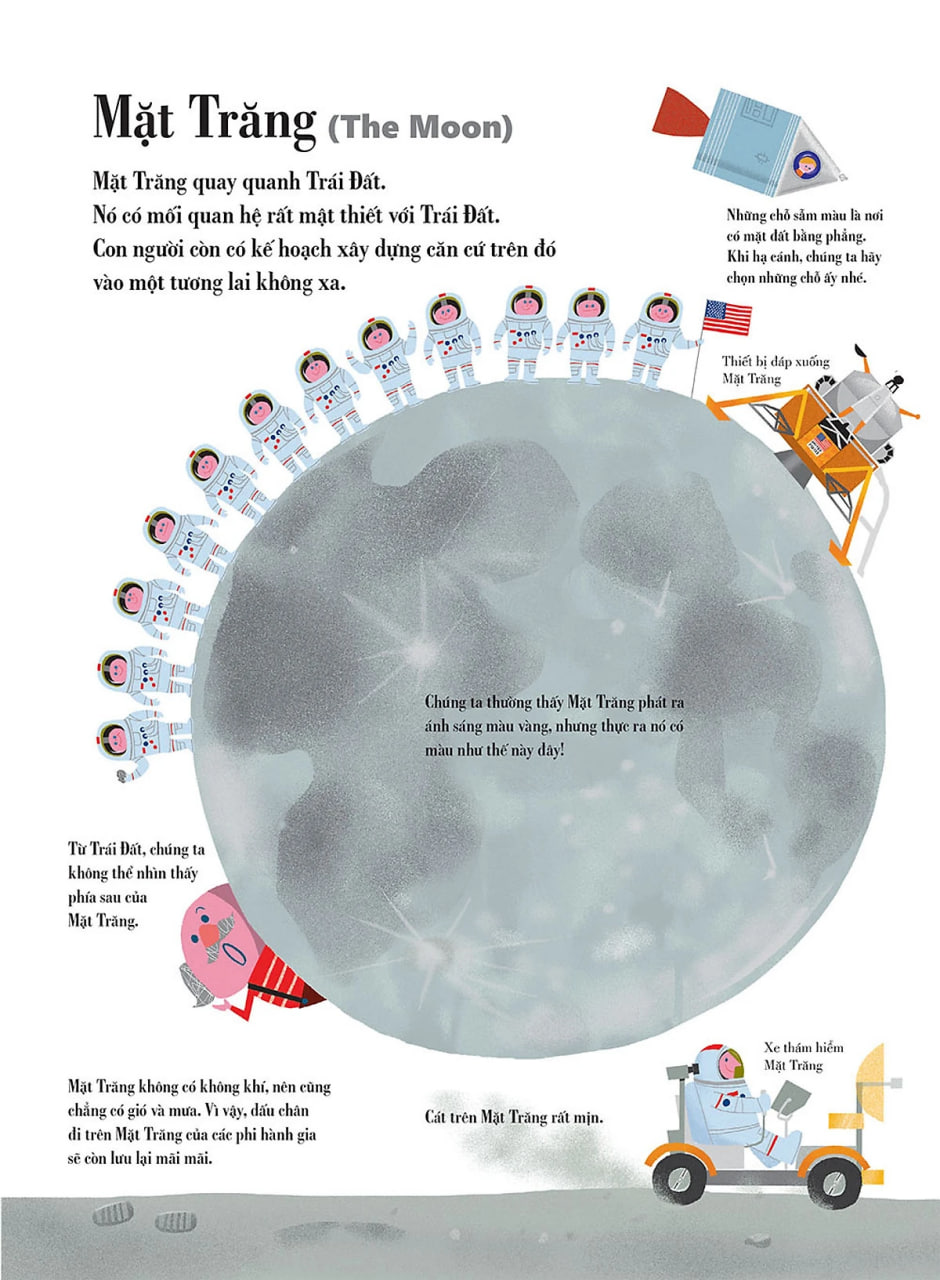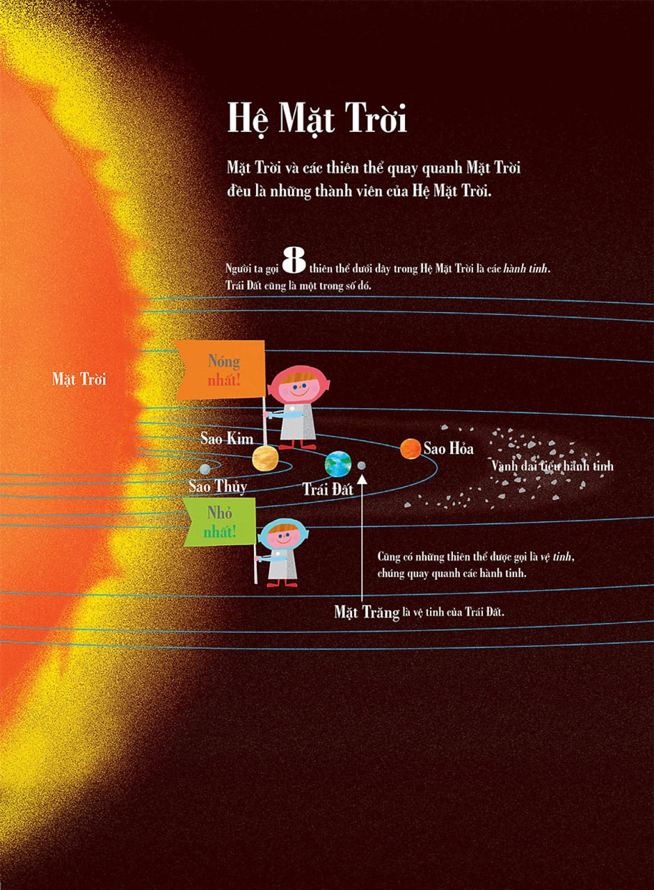 - Vũ trụ quanh ta gồm những hành tinh nào? Đặc điểm nổi bật của các hành tinh trong Hệ Mặt Trời là gì? Từ Trái Đất đi đến Mặt Trăng cần bao nhiêu thời gian? Trái Đất được hình thành như thế nào? Những câu hỏi vô cùng hóc búa này sẽ được Cuốn sách tranh đầu tiên về vũ trụ giải đáp cho các bạn nhỏ một cách dễ hiểu và gần gũi.