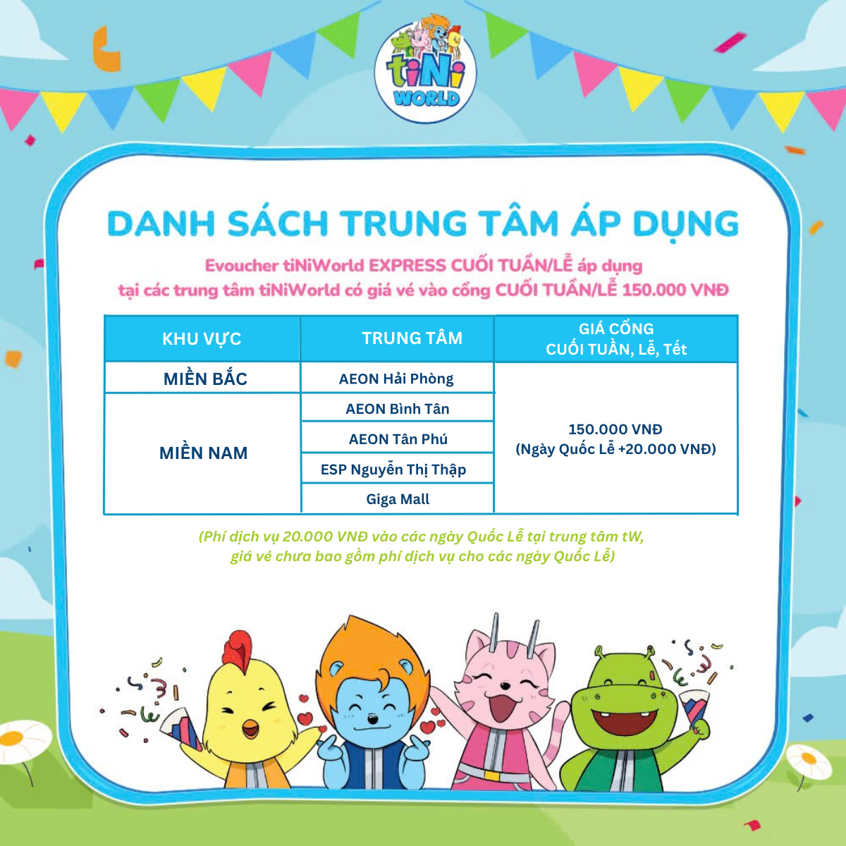 - Các ngày Quốc Lễ theo quy định Nhà nước sẽ có mức phí dịch vụ 20.000 VNĐ tính trên vé cổng Cuối Tuần/Lễ, giá vé chưa bao gồm phí phụ thu cho các ngày Quốc Lễ. Phí phụ thu sẽ được thanh toán tại trung tâm tiNiWorld.