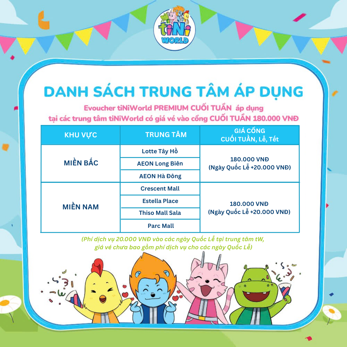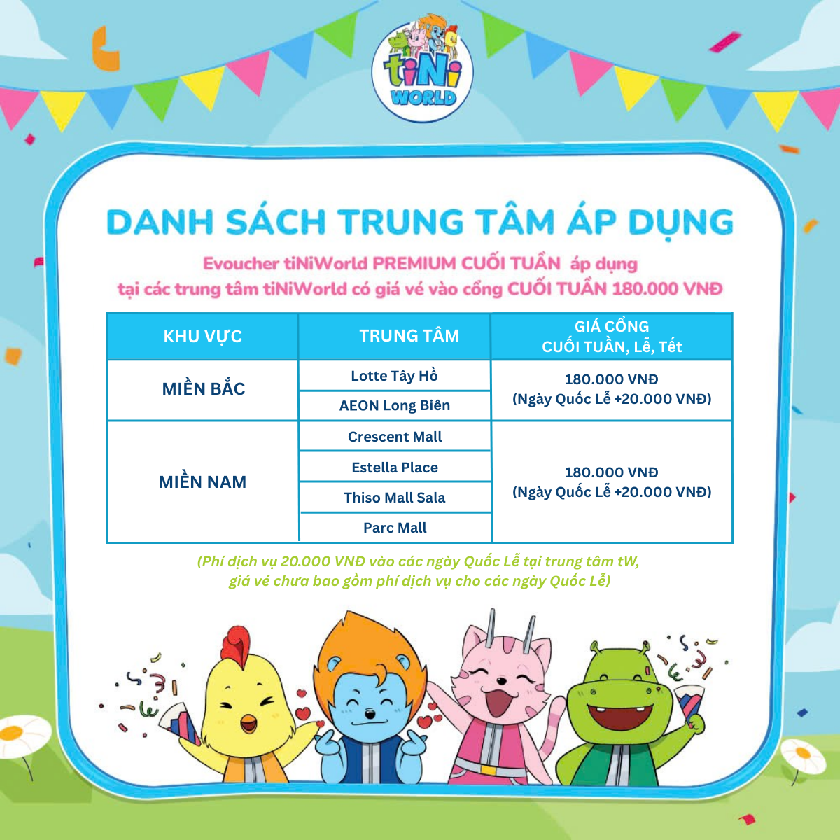 Thông số kỹ thuật Vé vào cổng điện tử tiNiWorld PREMIUM CUỐI TUẦN/LỄ áp dụng tại các trung tâm tiNiWorld có giá vé vào cổng 180.000 VNĐ