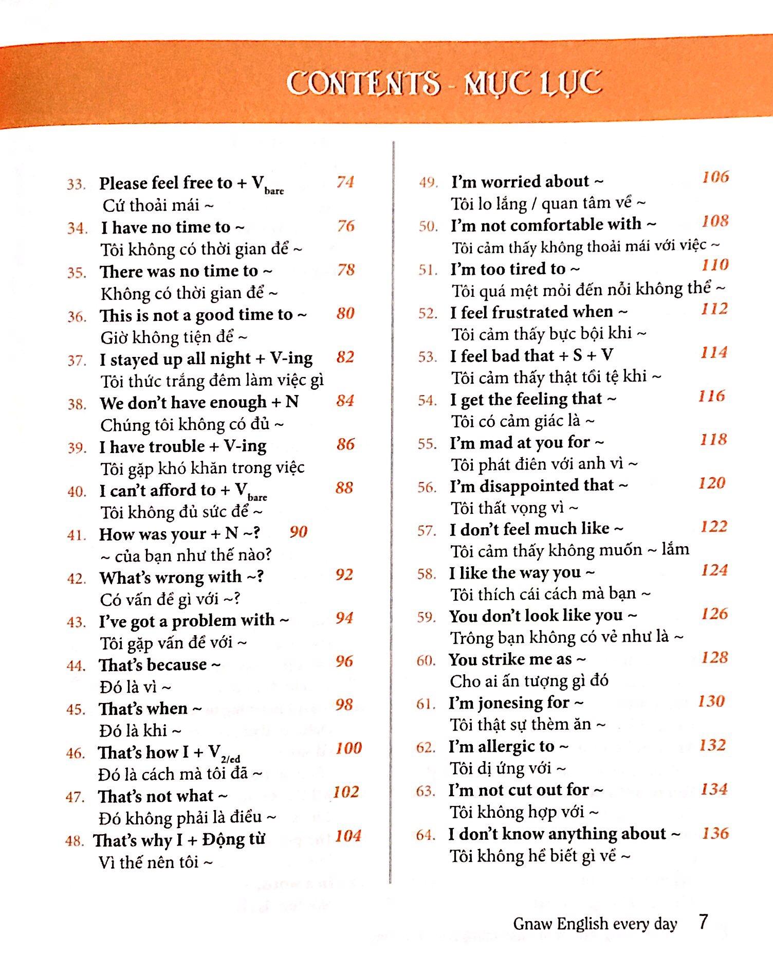 + Giúp bạn học ngữ pháp cơ bản (đồng thời là các mẫu câu giao tiếp căn bản) một cách dễ dàng, ghi nhớ ngữ pháp nhanh chóng và mãi mãi, thông qua việc vận dụng được tiếng Anh trong cuộc sống hằng ngày cũng như trong công việc. Các câu ví dụ minh họa với từ vựng cơ bản, thông dụng, giúp bạn cảm thấy việc học ngữ pháp dễ dàng, không cứng nhắc, không còn mệt mỏi. Ví dụ: I’m busy + V-ing , I’m too + Adj + to V-bare, I’m getting used to + N/V-ing, I’m looking forward to + Ving, I feel like + V-ing, I’m afraid of/for/to/that, … Từ đó tăng tốc độ nói và viết của bạn, KHÔNG CÒN SAI NỮA, KHÔNG CÒN QUÊN NỮA vì cấu trúc ấy đã in sâu vào não bạn rồi, khi cần là có thể bật ra nói/viết ngay được luôn, không cần phải cố gắng lôi nó ra như trước đây nữa.