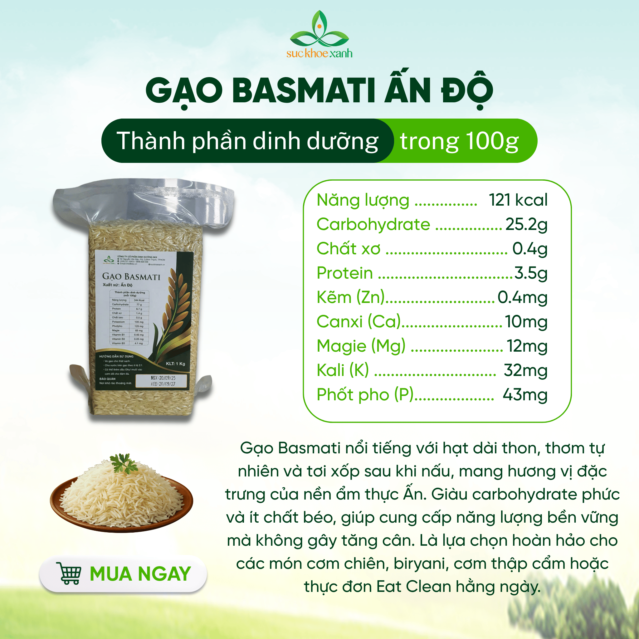 Gạo Basmati Ấn Độ Đạt tiêu chuẩn xuất khẩu sang châu Âu. Theo Bộ Nông nghiệp Hoa Kỳ (The U.S. Department of Agriculture – USDA), gạo basmati là một loại gạo hạt dài được trồng chủ yếu ở Ấn Độ và Pakistan. Gạo basmati có 2 dạng: gạo trắng và gạo nâu. Do có chứa ít carbohydrate nên gạo basmati không dẻo và không dính như những loại gạo thông thường khác.