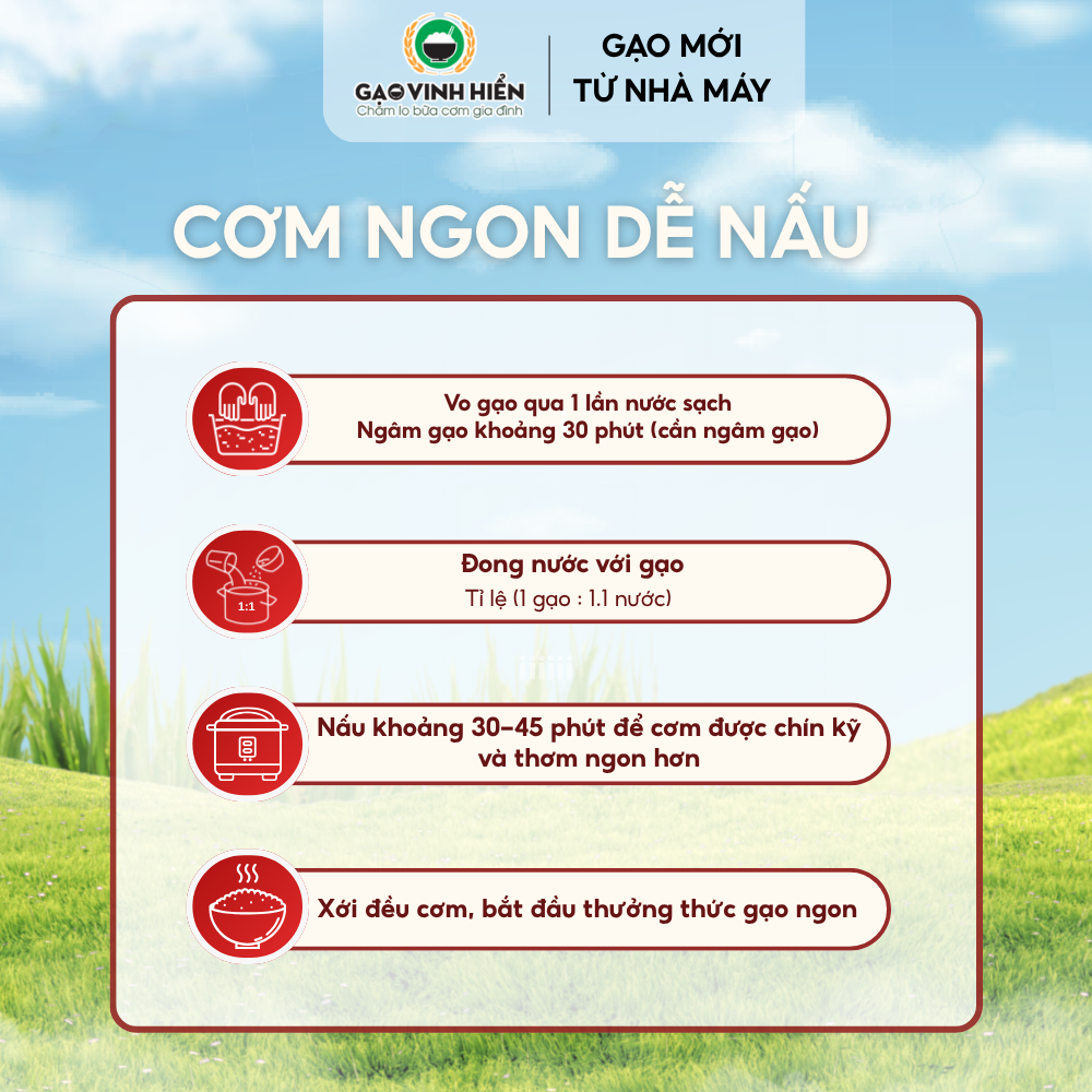 - Lưu ý khi nấu: ngâm gạo 20-30 phút trước khi nấu để cơm có độ dẻo, mềm, ngon đúng chuẩn.