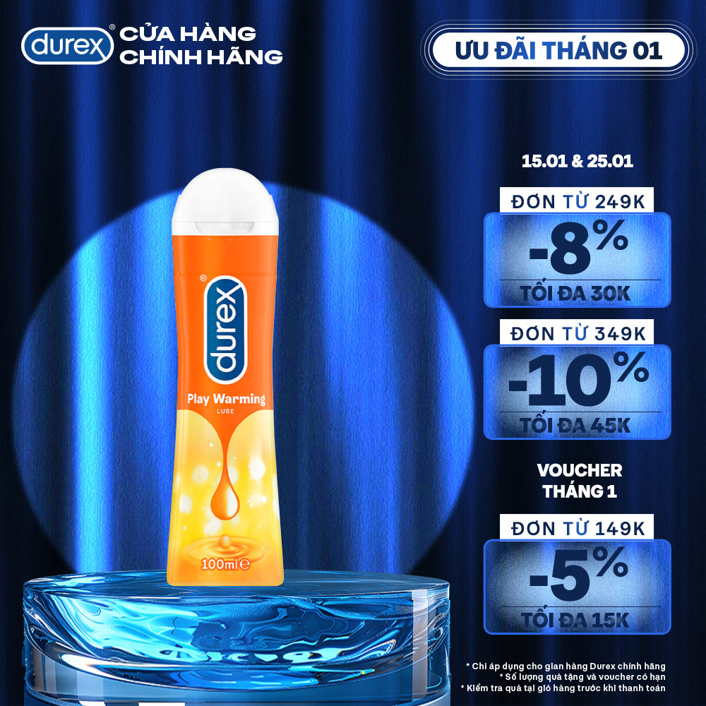 - Gel Bôi Trơn Durex Play Warming giúp cuộc yêu trở nên mặn mà và nồng nhiệt hơn. Gel giúp bôi trơn, tăng độ ẩm, mang lại cảm giác mịn màng, êm ái, thoải mái cho các nàng. Sản phẩm được sản xuất theo tiêu chuẩn chất lượng quốc tế, tuyệt đối an toàn cho người sử dụng, dung tích 100ml. Gel bôi trơn Durex giúp cả hai khởi động và giữ lửa cuộc yêu, cho sự lãng mạn dài lâu.