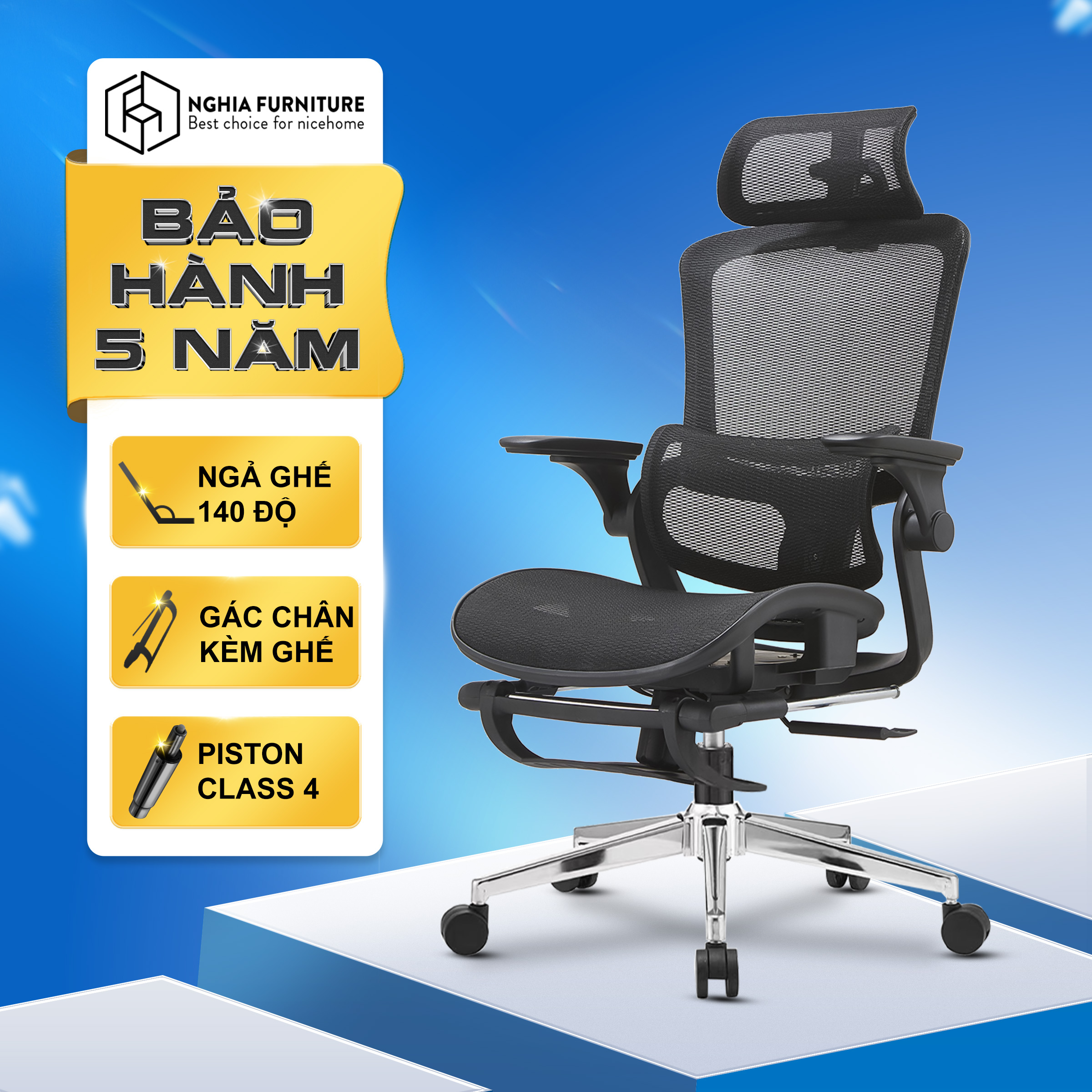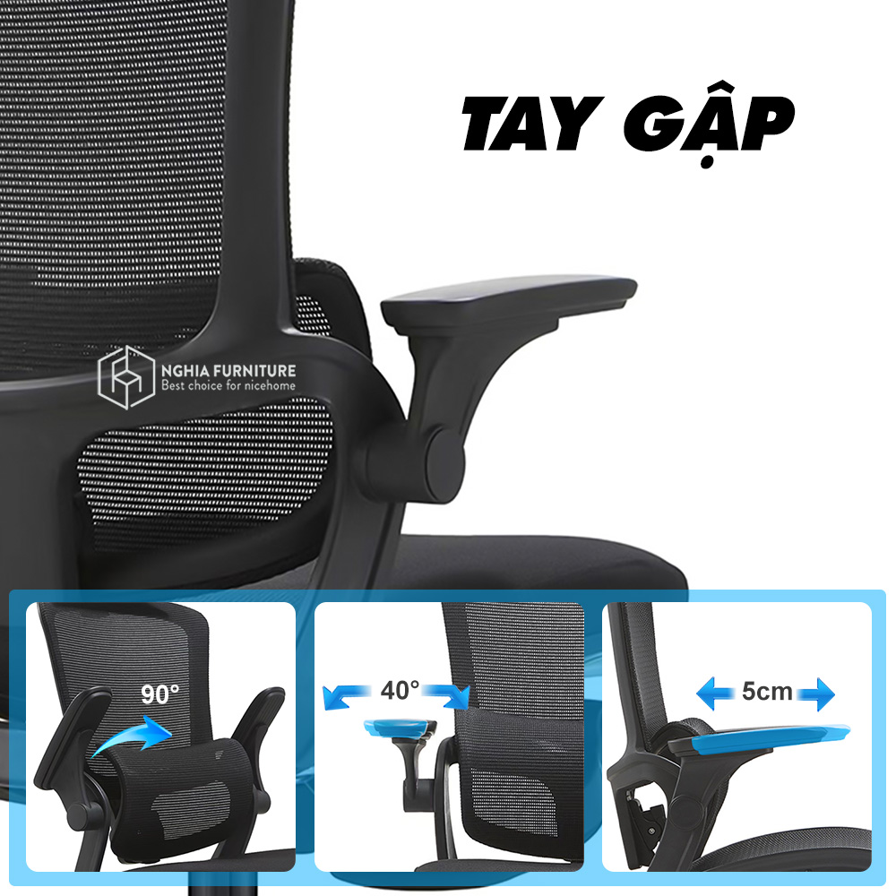 Thông số kỹ thuật Ghế công thái học Nghiafurniture Mirai - Tối ưu về giá, tối đa tính năng, ngả lưng 140 độ, có gác chân, piston class4