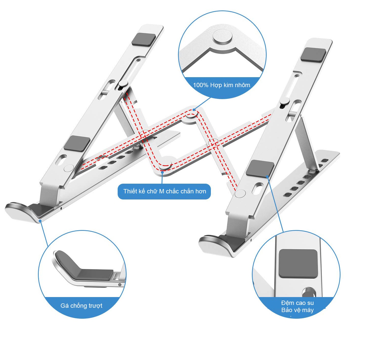 Giá Đỡ Laptop Hợp Kim Nhôm Cao Cấp Có Thể Gấp Gọn - Đế Tản Nhiệt Laptop - Macbook, Máy Tính Xách Tay - 07 Vị Trí Điều Chỉnh Góc Độ - Hàng Chính Hãng - VinBuy