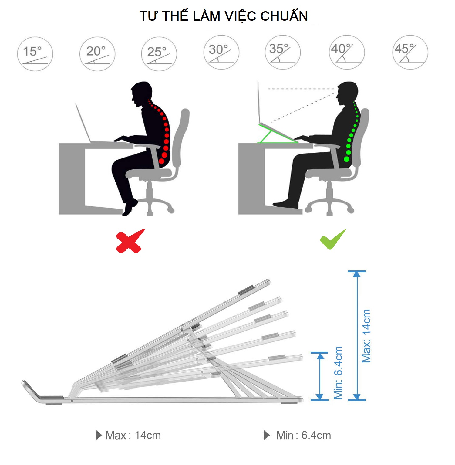 Linh hoạt tuỳ chỉnh độ cao theo nhiều cấp độ. Chống mỏi lưng, mỏi cổ, hạn chế các bệnh lý khi làm việc quá nhiều với máy tính.