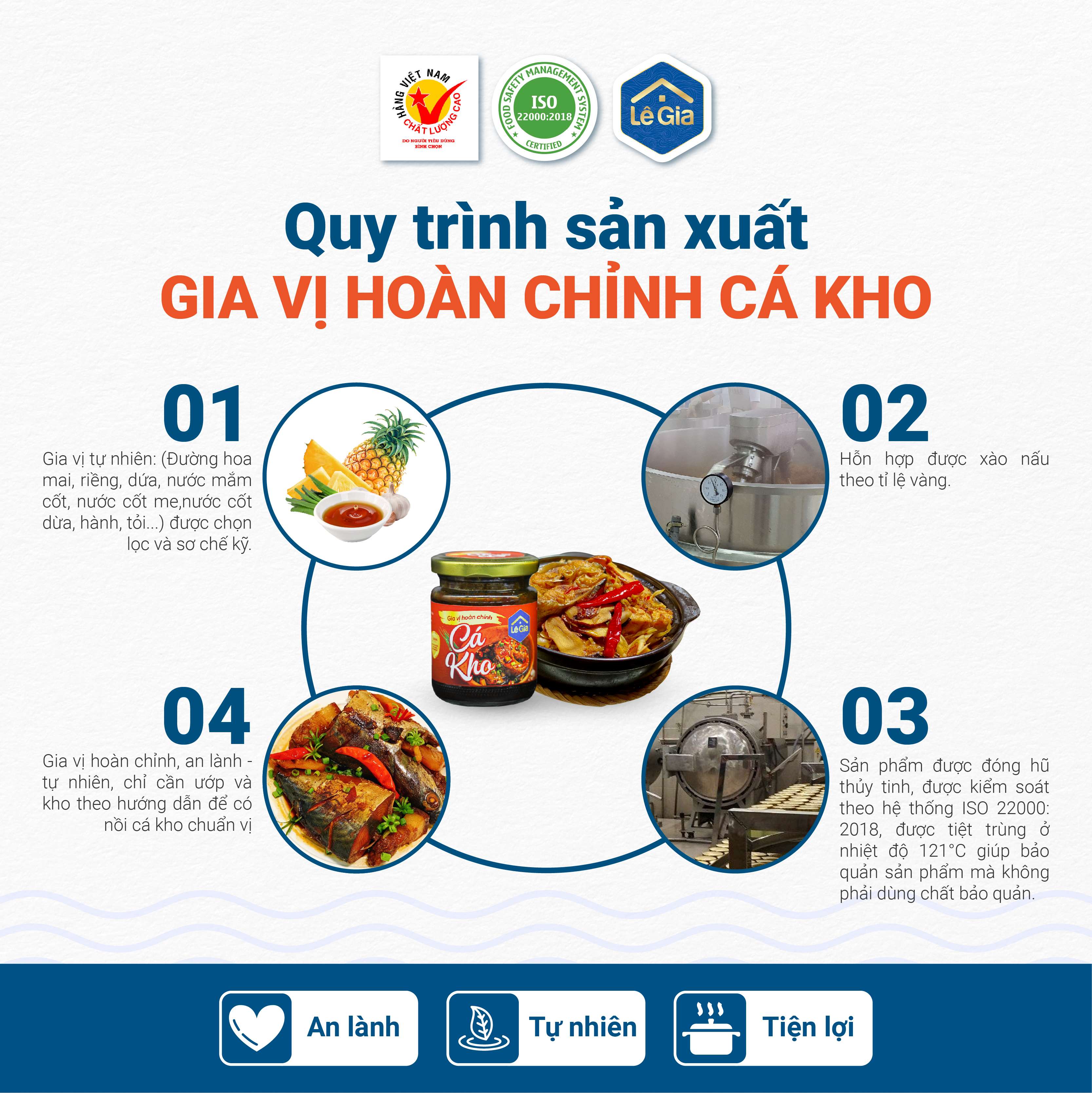 Từ nước mắm cốt đặc biệt và gia vị thiên nhiên chọn lọc (đường hoa mai, nước cốt dừa, tiêu đen, riềng, hành, dứa) với tỉ lệ vàng cùng công thức chế biến cầu kỳ, không sử dụng phụ gia (bảo quản, tạo vị, tạo màu) cho ra đời Gia vị hoàn chỉnh cá kho Lê Gia, béo thơm mùi mắm truyền thống, ngọt thanh vị đường quyện cùng hương vị đặc trưng của gia vị. Chỉ cần dùng Gia vị hoàn chỉnh cá kho Lê Gia, mà không cần phải thêm gia vị gì khác, sẽ có món kho thịt và kho cá thơm ngon, an lành.