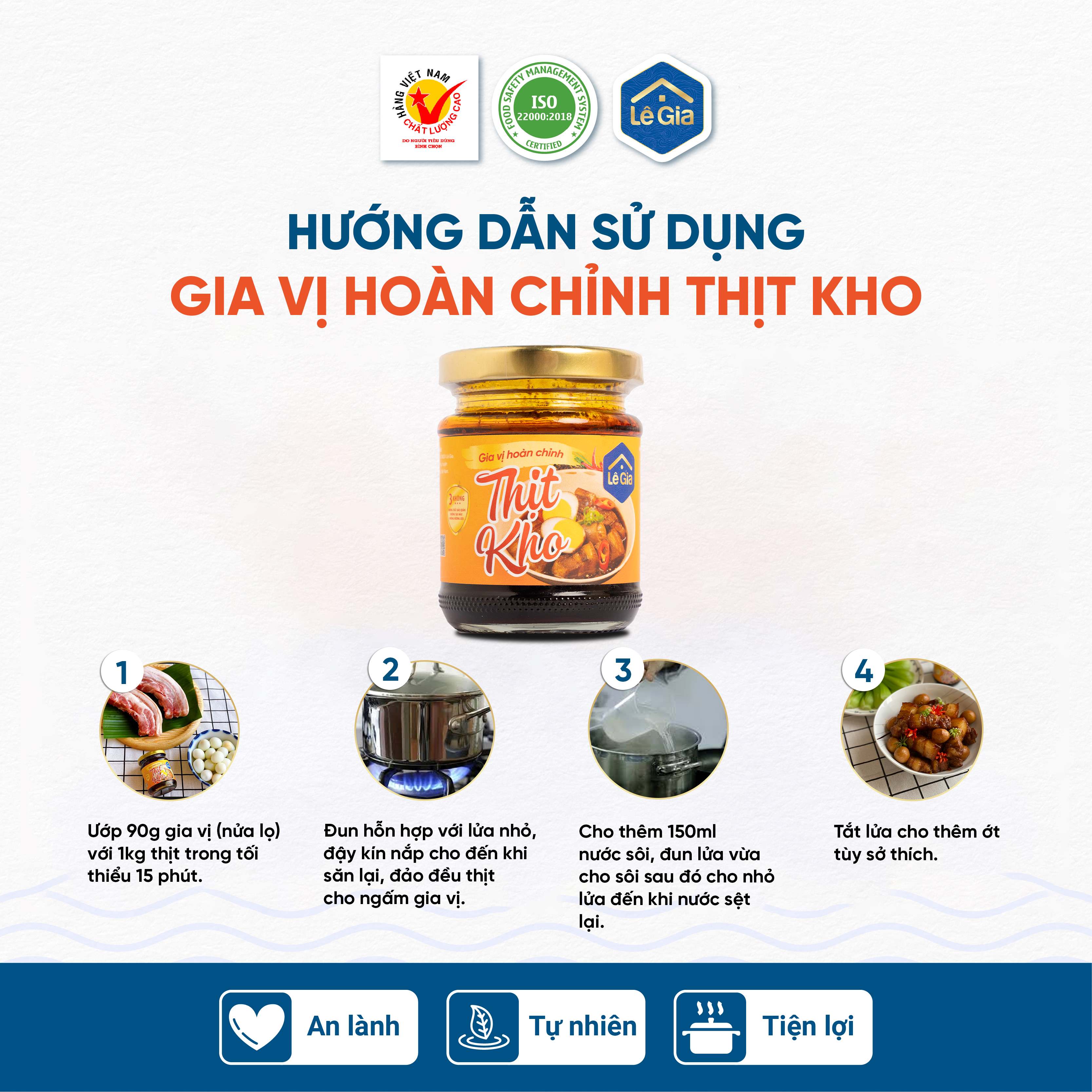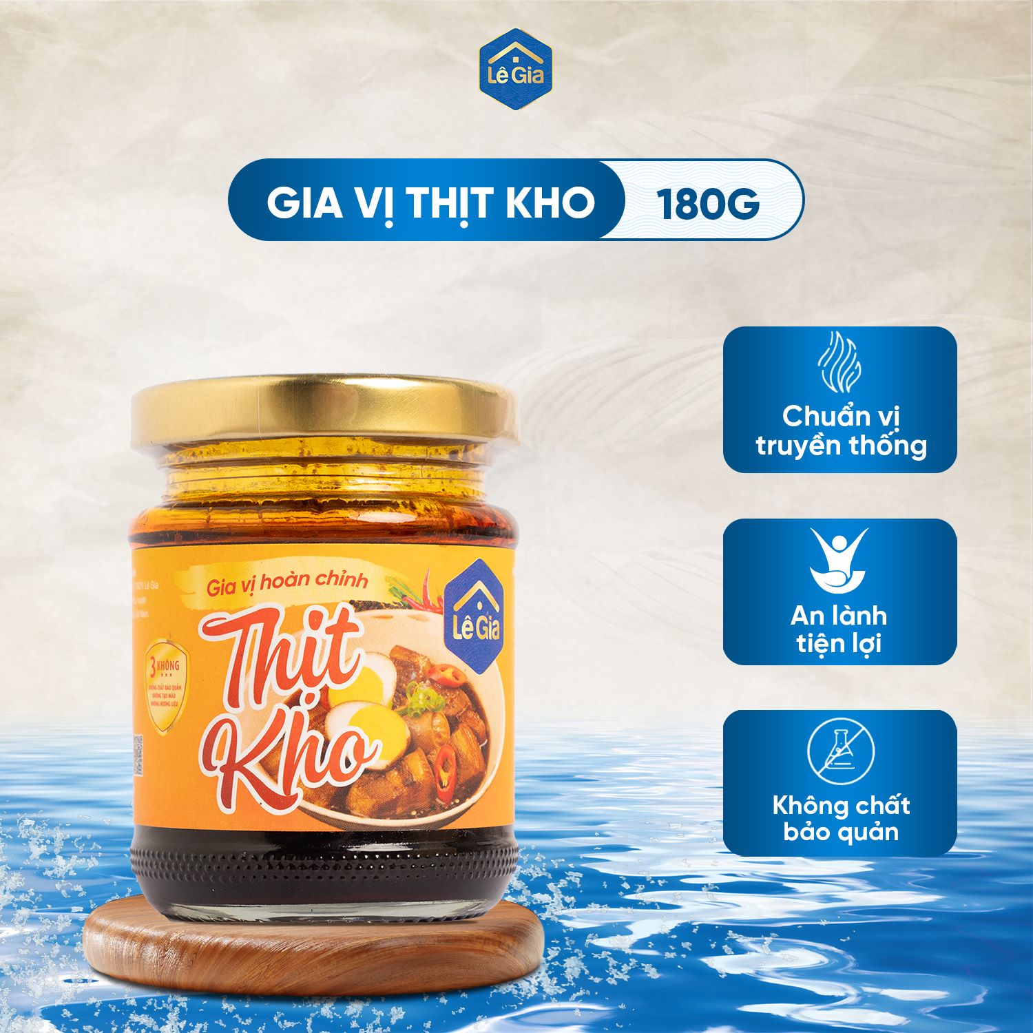 Từ nước mắm cốt đặc biệt và gia vị thiên nhiên chọn lọc (đường hoa mai, nước cốt dừa, tiêu đen, riềng, hành, dứa) với tỉ lệ vàng cùng công thức chế biến cầu kỳ, không sử dụng phụ gia (bảo quản, tạo vị, tạo màu) cho ra đời Gia vị hoàn chỉnh thịt kho Lê Gia, béo thơm mùi mắm truyền thống, ngọt thanh vị đường quyện cùng hương vị đặc trưng của gia vị. Chỉ cần dùng Gia vị hoàn chỉnh thịt kho Lê Gia, mà không cần phải thêm gia vị gì khác, sẽ có món kho thịt thơm ngon, an lành.