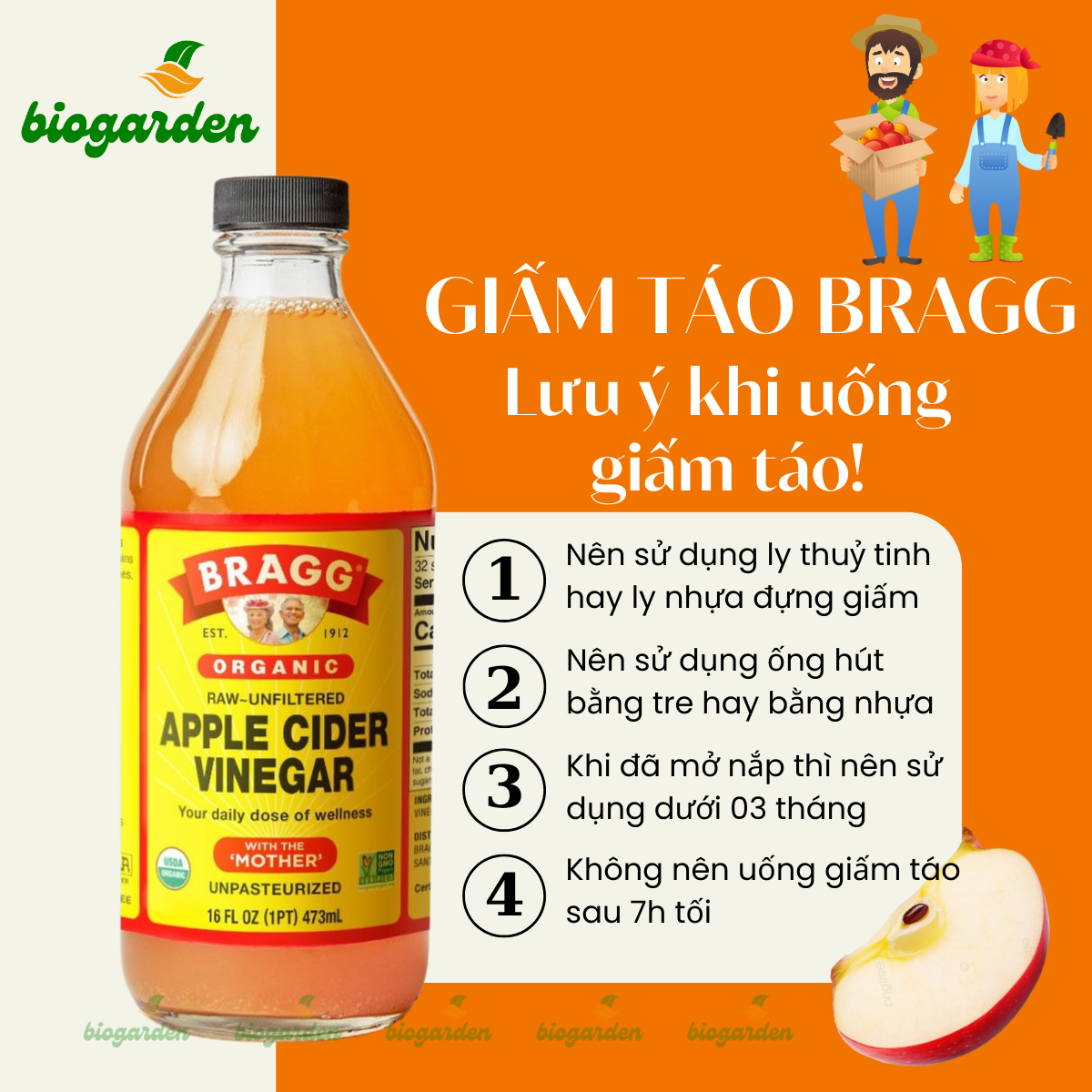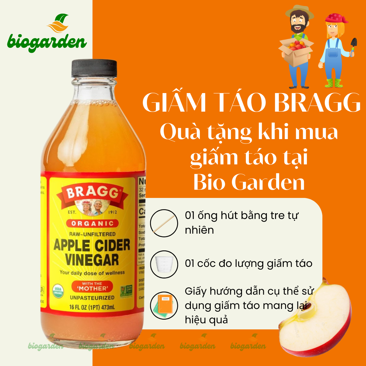 Giấm táo hữu cơ Bragg là thương hiệu nổi tiếng ở Mỹ và toàn cầu. Đây là loại giấm đạt tiêu chuẩn hữu cơ USDA Organic. Đây cũng là loại giấm hữu cơ có chứa 5% acid được làm từ táo hữu cơ được trồng tại Hoa Kỳ, có giấm cái thực sự “sống”, không khử trùng và không lọc. Quá trình thu hái, sản xuất, đóng gói, bảo quản, vận chuyển đều tuân thủ nguyên tắc chặt chẽ của cơ quan thuốc và thực phẩm của Hoa Kỳ FDA. Chính vì vậy mà màu sắc của giấm rất đặc trưng là từ màu hổ phách tới nâu vàng