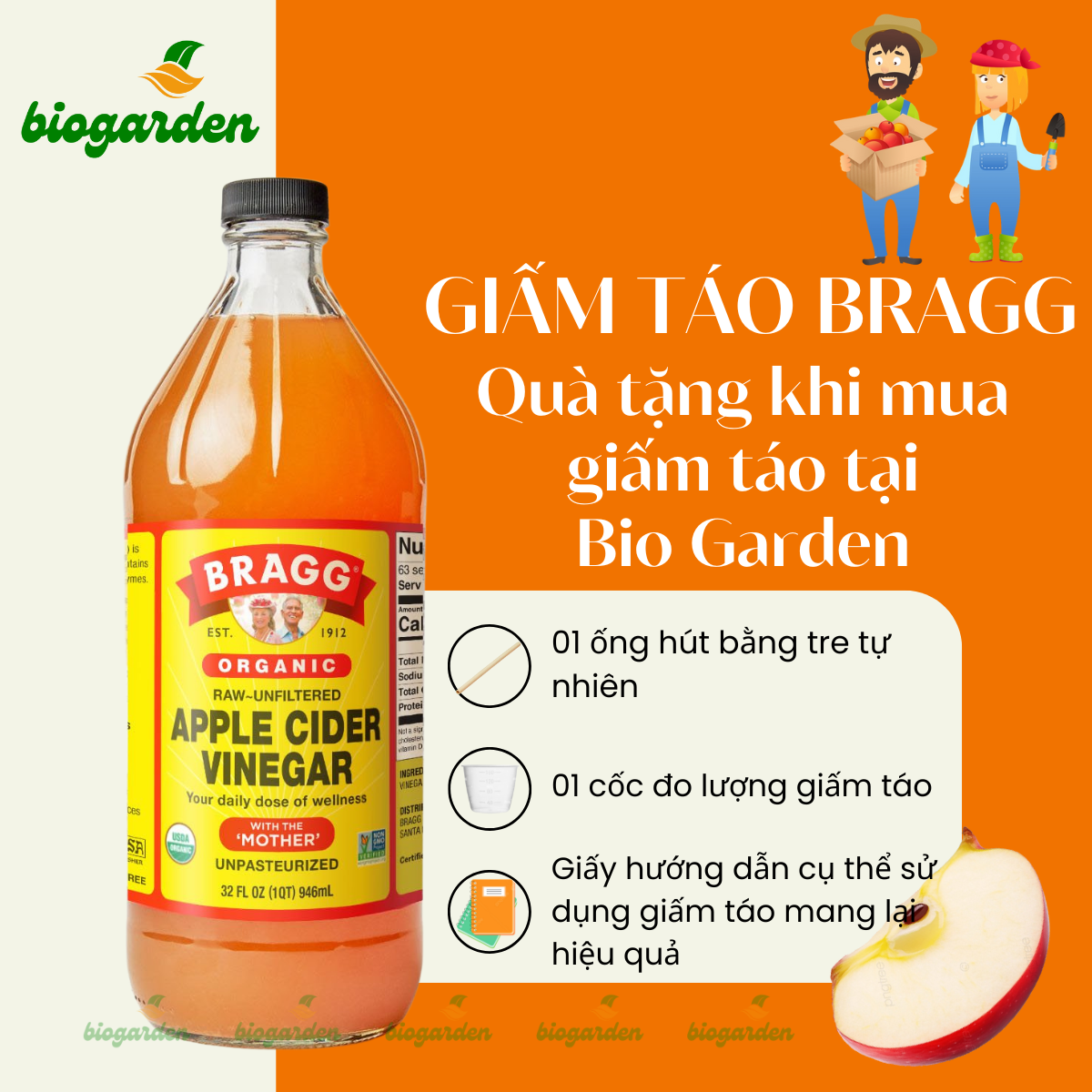 Giấm táo hữu cơ Bragg là thương hiệu nổi tiếng ở Mỹ và toàn cầu. Đây là loại giấm đạt tiêu chuẩn hữu cơ USDA Organic. Đây cũng là loại giấm hữu cơ có chứa 5% acid được làm từ táo hữu cơ được trồng tại Hoa Kỳ, có giấm cái thực sự “sống”, không khử trùng và không lọc. Quá trình thu hái, sản xuất, đóng gói, bảo quản, vận chuyển đều tuân thủ nguyên tắc chặt chẽ của cơ quan thuốc và thực phẩm của Hoa Kỳ FDA. Chính vì vậy mà màu sắc của giấm rất đặc trưng là từ màu hổ phách tới nâu vàng.