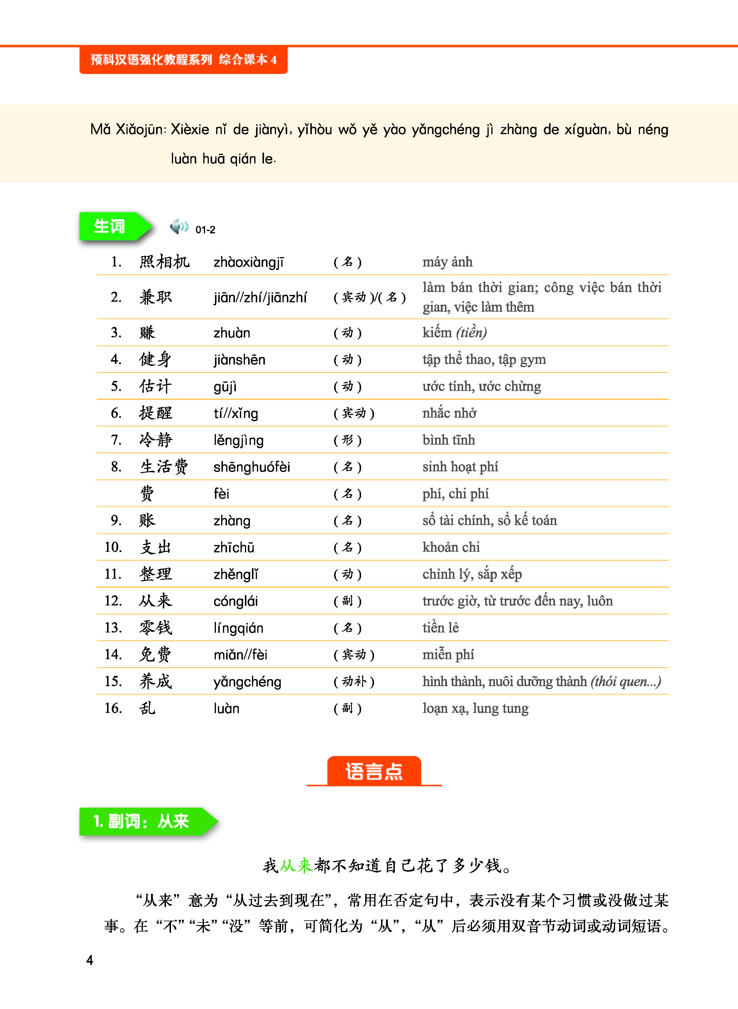 - Quyển 3-4 trải đều toàn bộ 1200 từ cùng với điểm ngôn ngữ của Đề cương HSK cấp 4. Bài khóa được biên soạn dựa trên Đề cương chủ đề đàm thoại HSK cấp 4, đồng thời nâng cao và mở rộng các chủ đề đàm thoại có liên quan. Người học sau khi học xong quyển 3-4, tiếng Trung có thể đạt đến trình độ HSK cấp 4.