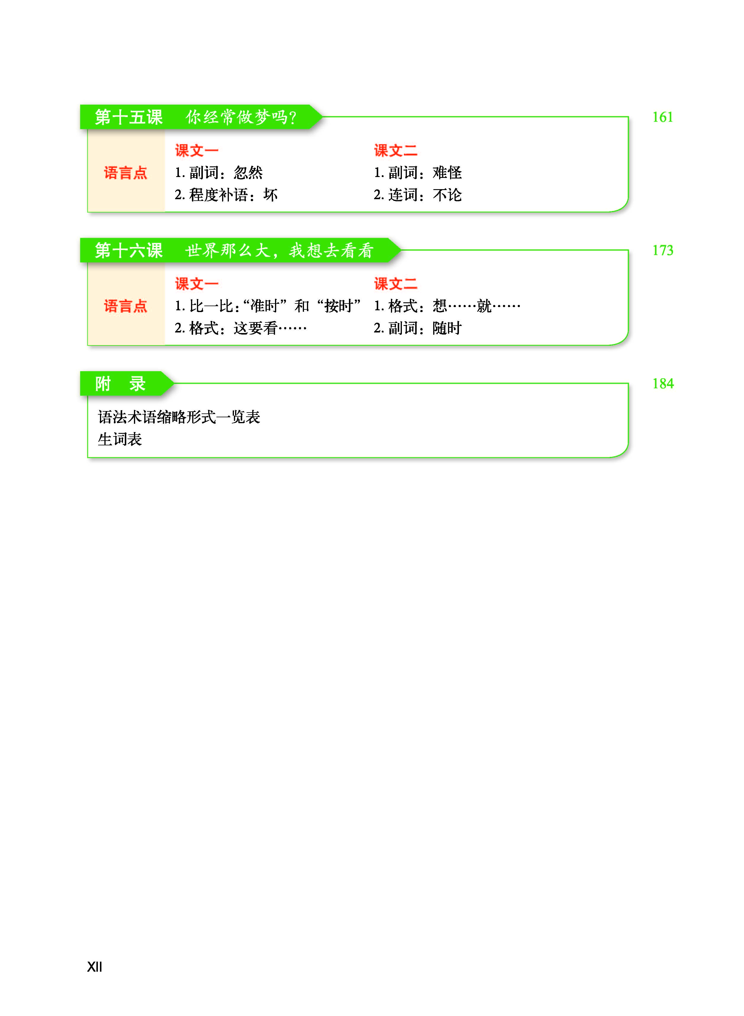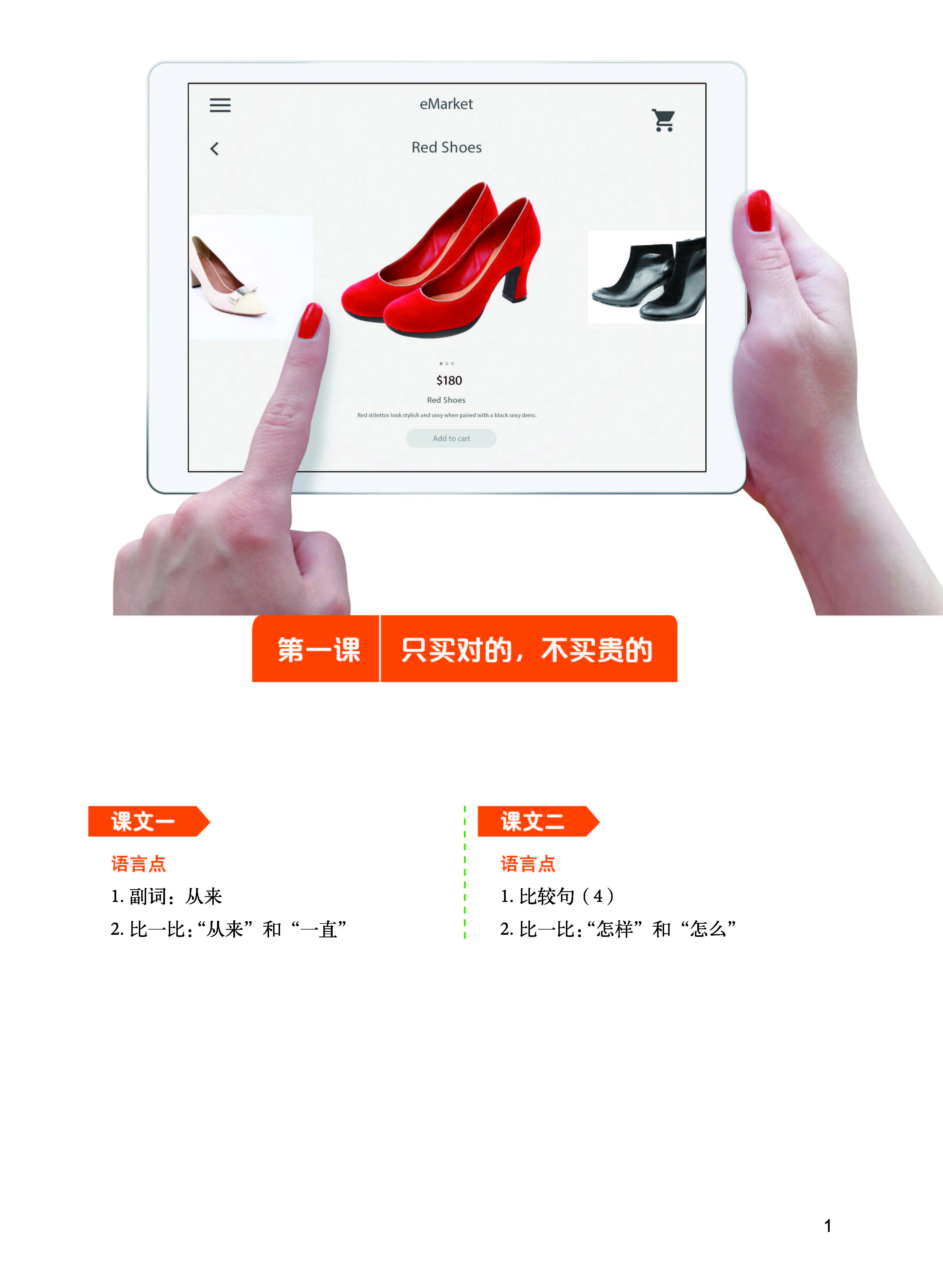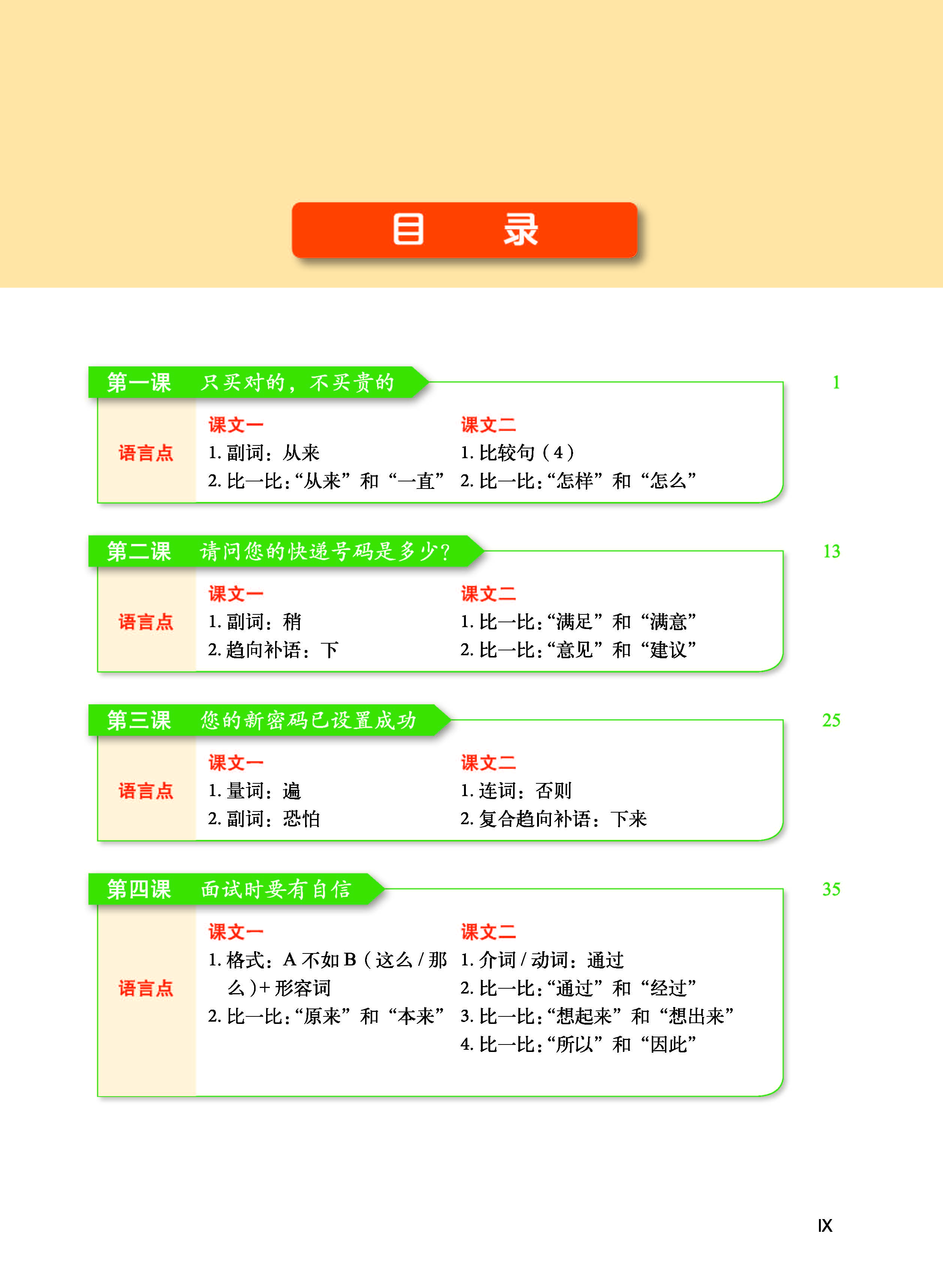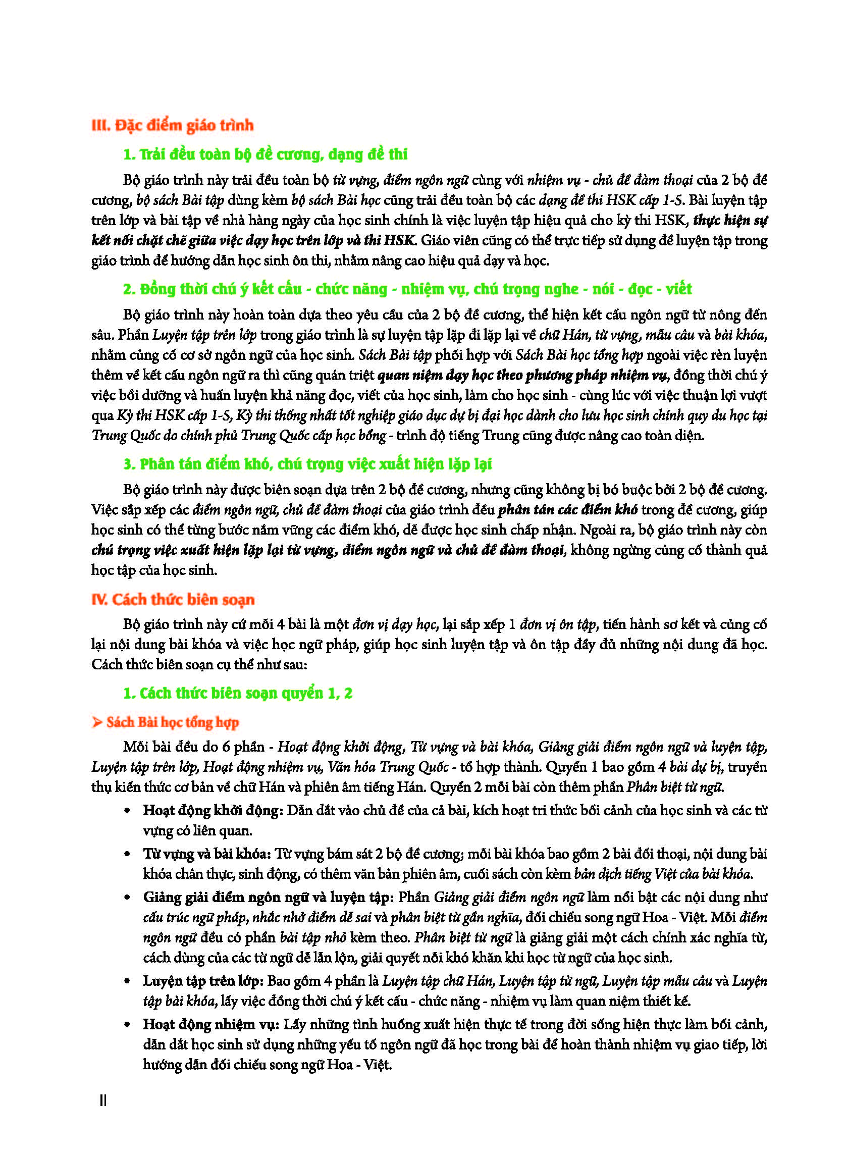 - Quyển 1-2 trải đều toàn bộ 600 từ của Đề cương HSK cấp 1-3, bao gồm một phần từ HSK cấp 4, trải đều toàn bộ các điểm ngôn ngữ của Đề cương HSK cấp 1-3. Bài khóa được biên soạn dựa theo Đề cương chủ đề đàm thoại HSK cấp 1-3, trên cơ sở chú trọng tính chân thực. Người học sau khi học xong quyển 1, tiếng Trung có thể đạt đến trình độ HSK cấp 2; sau khi học xong quyển 2, tiếng Trung có thể đạt đến trình độ HSK cấp 3.