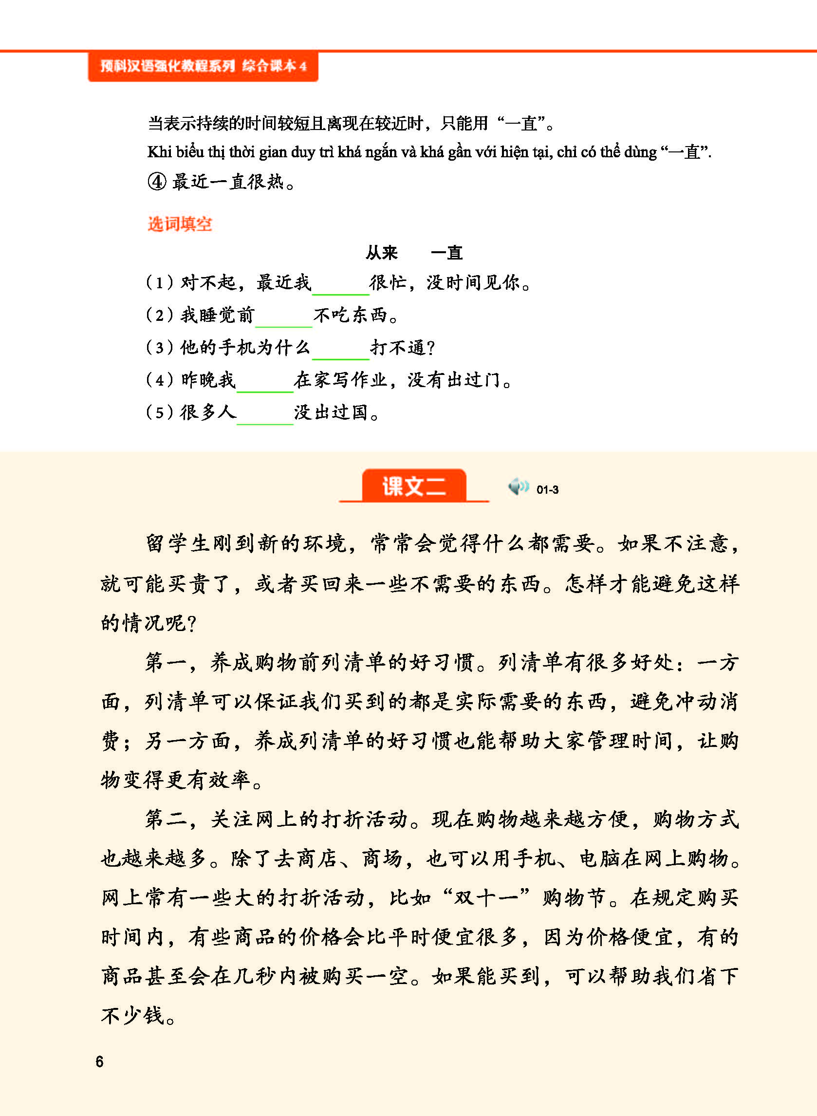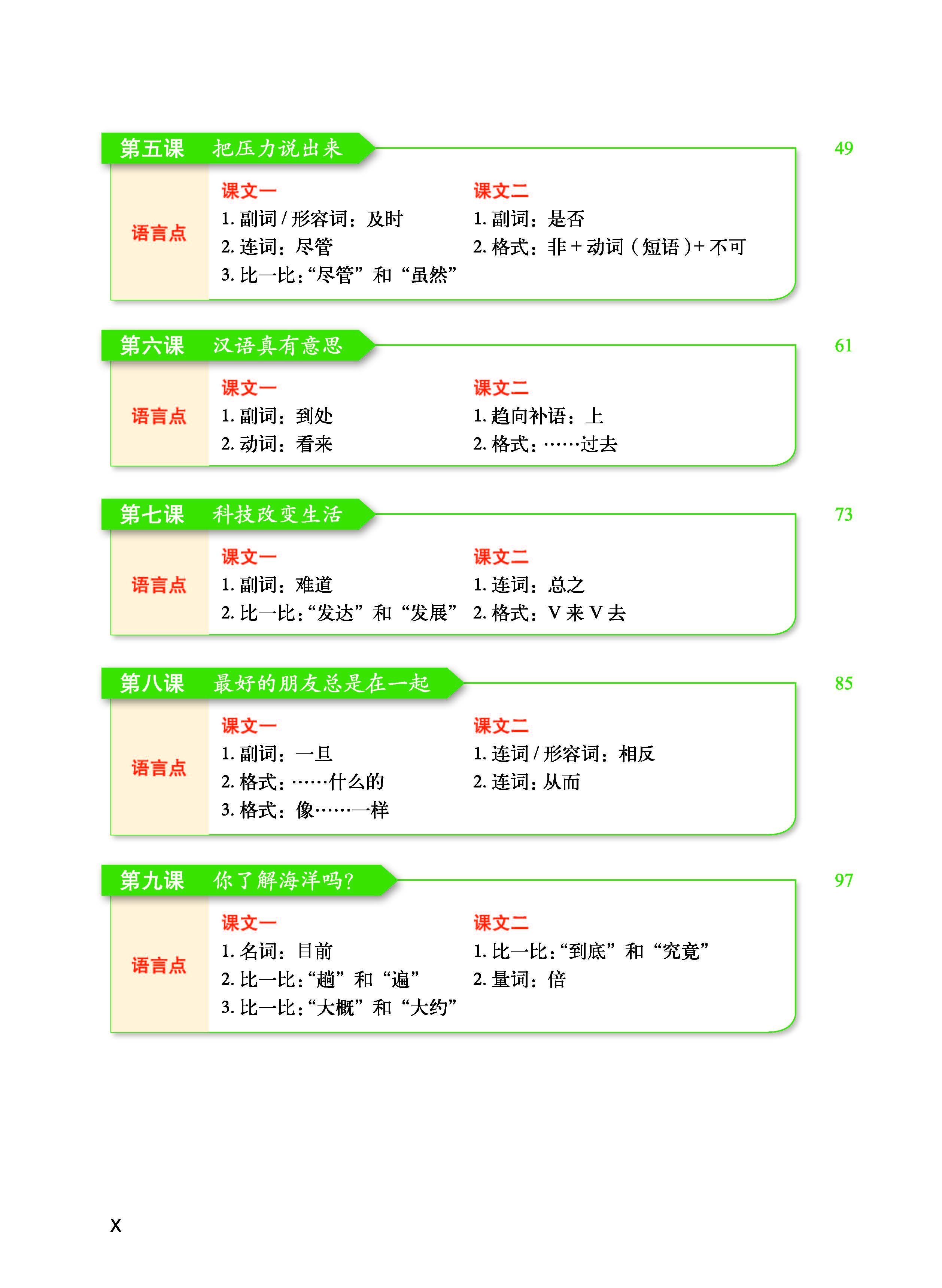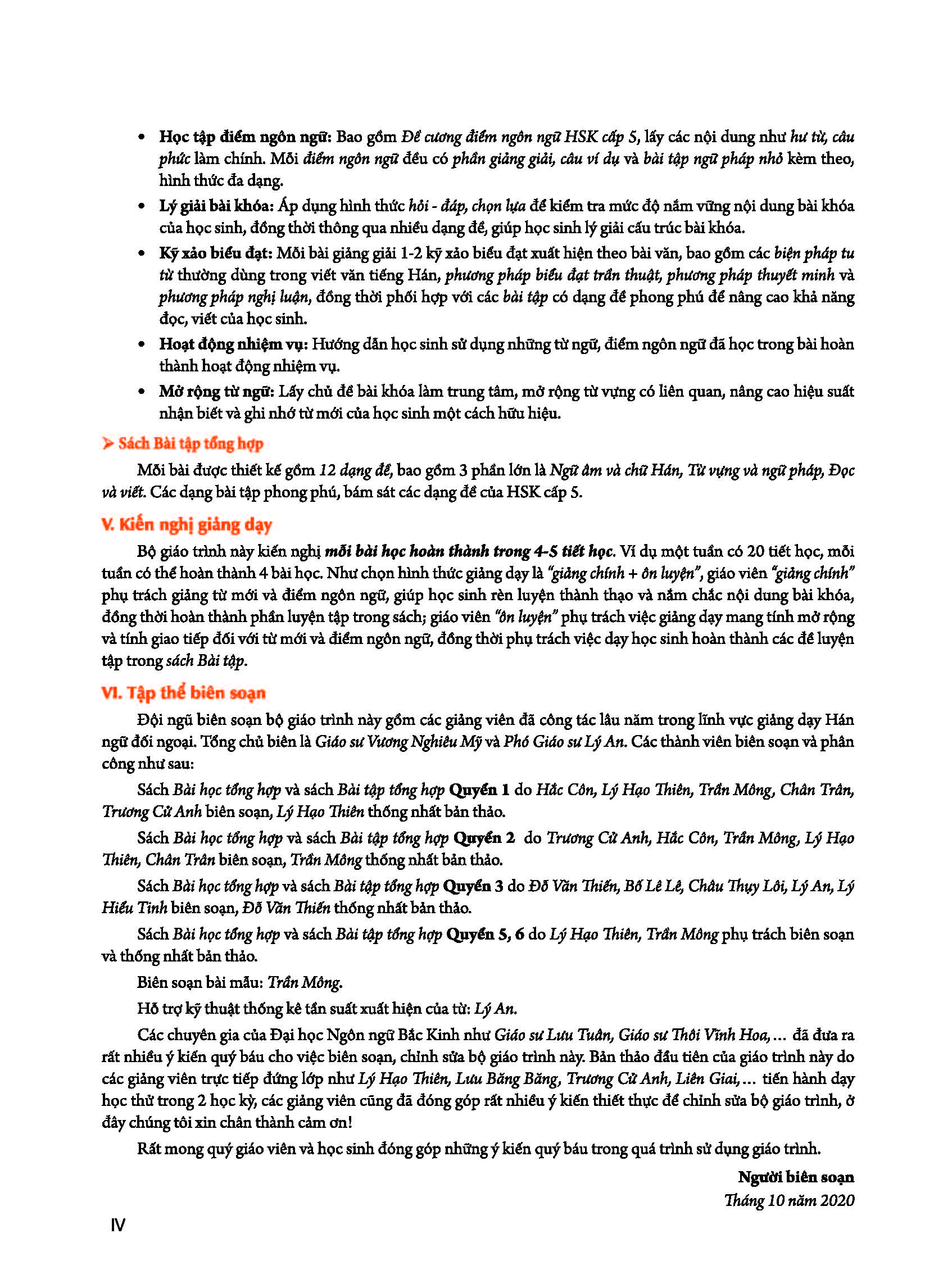 - Quyển 5-6 trải đều toàn bộ 2500 từ của Đề cương HSK cấp 5 và 3000 từ của đề cương “Kỳ thi tốt nghiệp giáo dục dự bị đại học dành cho lưu học sinh chính quy du học tại Trung Quốc do chính phủ Trung Quốc cấp học bổng”, đồng thời trải đều toàn bộ điểm ngôn ngữ của Đề cương HSK cấp 5. Bài khóa được biên soạn và viết lại dựa trên Đề cương chủ đề đàm thoại HSK cấp 5, chú trọng tính chân thực về nội dung, chú ý cả tính thú vị. Người học sau khi học xong quyển 5-6, tiếng Trung có thể đạt đến trình độ HSK cấp 5, đồng thời có thể thuận lợi thông qua Kỳ thi thống nhất tốt nghiệp giáo dục dự bị đại học dành cho lưu học sinh chính quy du học tại Trung Quốc do chính phủ Trung Quốc cấp học bổng.
