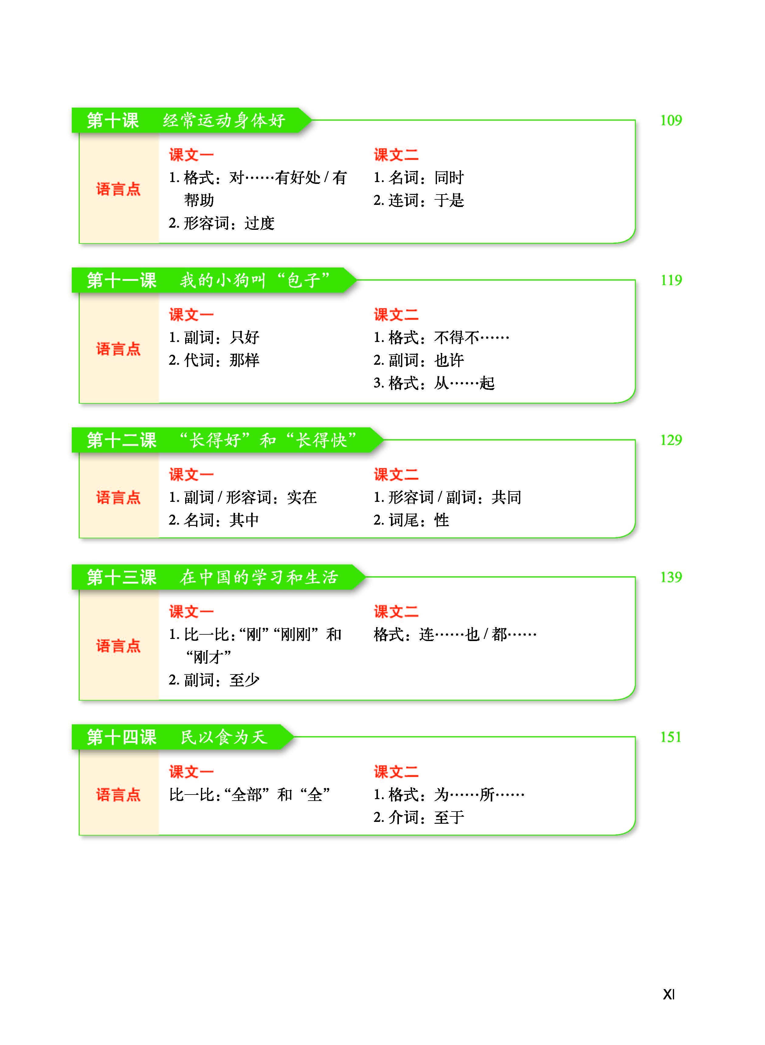 Bộ giáo trình này bao gồm 6 quyển Sách Bài học tổng hợp, 6 quyển Sách Bài tập tổng hợp. Bài học và Bài tập phối hợp với nhau, mỗi quyển 16 bài. Giáo trình tuân thủ nghiêm ngặt yêu cầu của “Đề cương thi HSK” và đề cương “Kỳ thi tốt nghiệp giáo dục dự bị đại học dành cho lưu học sinh chính quy du học tại Trung Quốc do chính phủ Trung Quốc cấp học bổng”, sắp xếp cụ thể như sau: