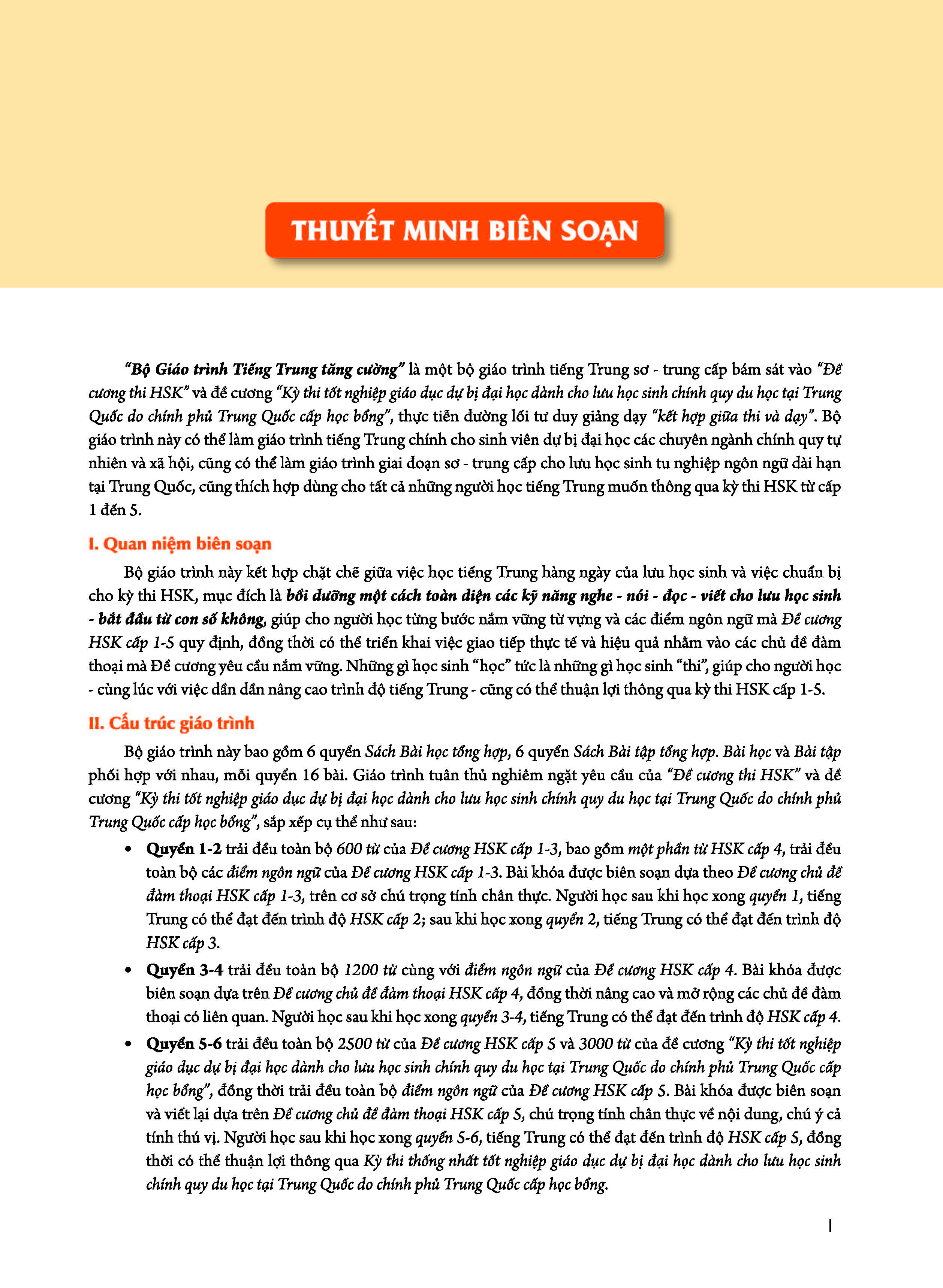 Bộ giáo trình bám sát hai đề cương là “Đề cương thi HSK” và đề cương “Kỳ thi tốt nghiệp giáo dục dự bị đại học dành cho lưu học sinh chính quy du học tại Trung Quốc do Chính phủ Trung Quốc cấp học bổng”, với mục đích bồi dưỡng một cách toàn diện các kỹ năng nghe - nói - đọc - viết cho học viên bắt đầu từ đầu, theo nguyên tắc “HỌC ĐỂ THI”. Học viên học theo bộ giáo trình có thể thi HSK từ cấp 1 đến cấp 5.