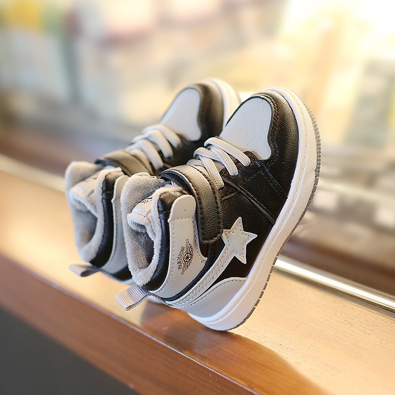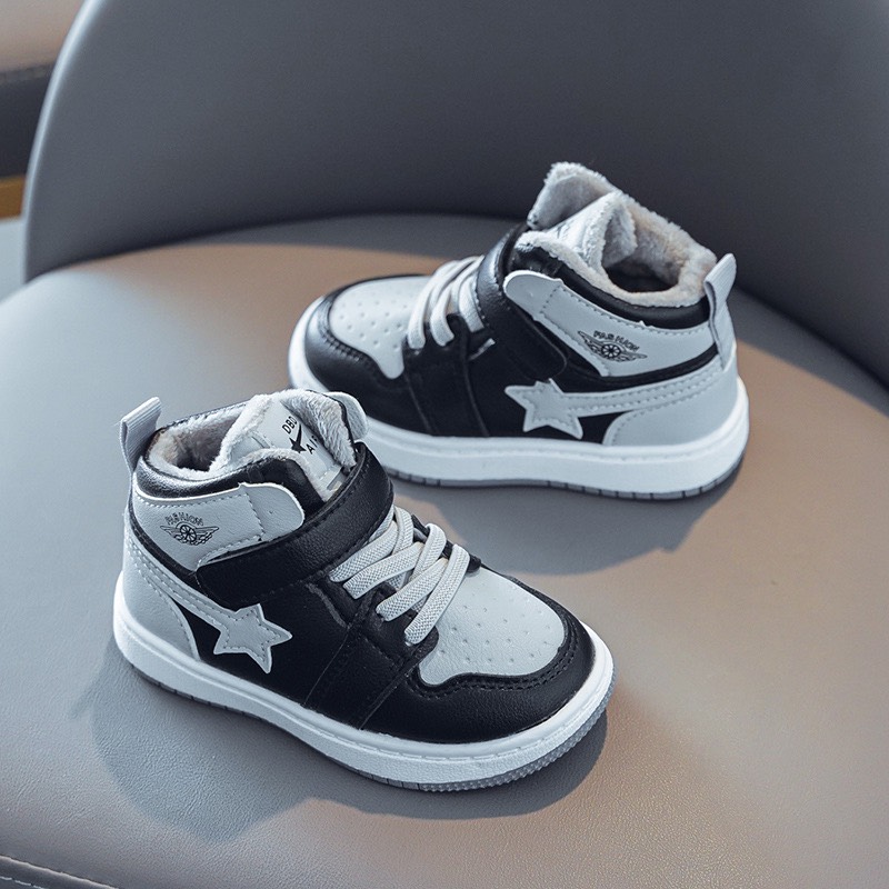 Giày thể thao bé trai 1 - 5 tuổi cổ cao lót lông ấm áp kiểu snearker cá tính GE93 được làm từ chất da PU mềm mại, kiểu dáng trang nhã thời trang quai dán tiện dung dễ dàng tháo sỏ. Đặc biệt, mẫu giày thể thao cho bé trai mềm nhẹ, đơn giản nhưng rất thời trang và cá tính giúp bé dễ dàng chạy nhảy mà không lo bí hoặc khó chịu cho đôi chân bé nhỏ khi mang giày. Màu sắc trắng kết hợp đen phối màu tinh tế, mẹ có thể kết hợp giày cùng quần áo phù hợp cho bé khi tham gia các hoạt động vui chơi, du lịch, chơi thể giày thể thao bé trai GE93 dòng size đa dang từ 1 - 5 tuổi, chất mềm nhẹ, êm và ấm sẽ là lựa chọn tuyêt vời cho bé yêu khi mùa đông về.