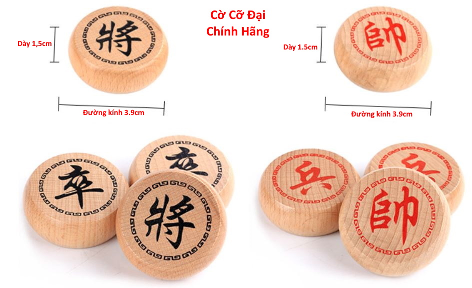 - Cỡ Đại với quân cờ đường kính 3,9cm dày 1,5cm.