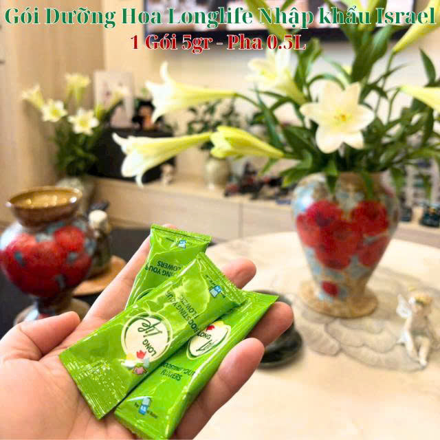 Bột Cắm Hoa tươi lâu LongLife 5gr với thành phần chính là đường chuyên dụng cho hoa cắt cành, giúp duy trì hoa tươi lâu gấp 2 lần, cung cấp đủ dinh dưỡng chăm sóc hoa cắm bình