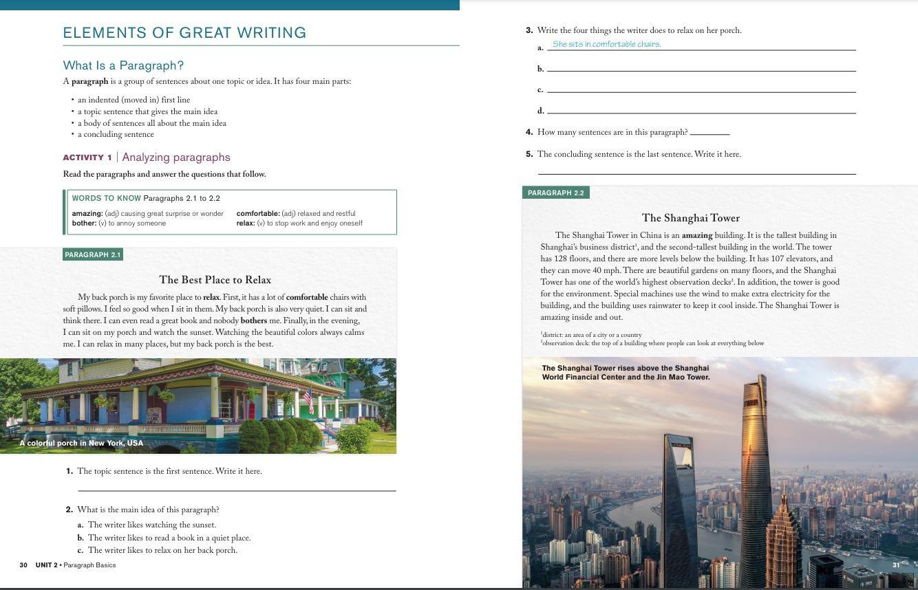 Part 5: New Test Prep section gives a test-taking tip and timed task to prepare for high-stakes standardized tests, including IELTs and TOEFL. The new guided online writing activity takes students through the entire writing process with clear models for reference each step of the way.