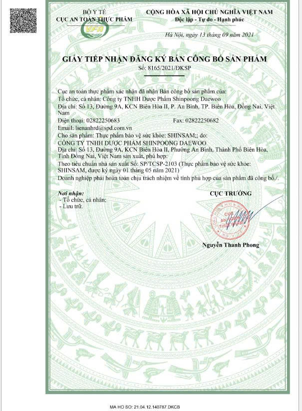 • Được kiểm soát chất lượng nghiêm ngặt bởi các tiêu chuẩn GMP, GLP, GSP & GDP. Chứng nhận bởi Dược Phẩm Shinpoong Daewoo