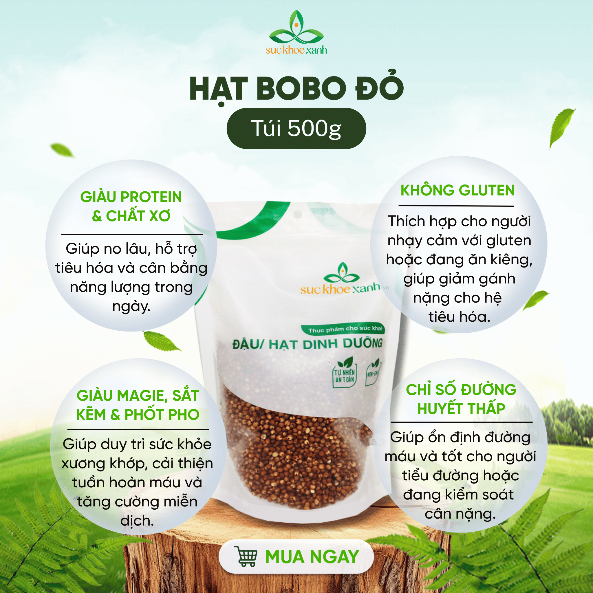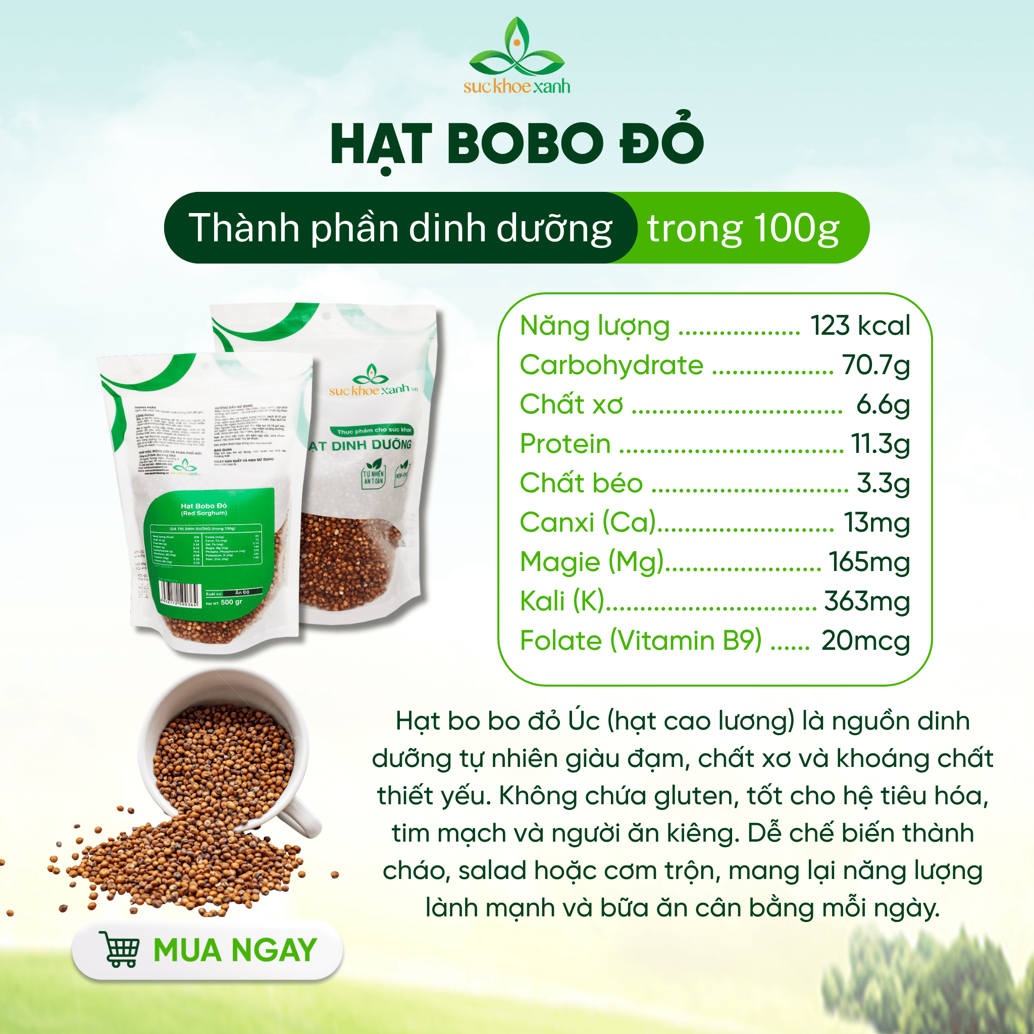 Thông số kỹ thuật Hạt Bobo (Cao lương) đỏ Sức Khỏe Xanh, Túi 500g nhập khẩu từ Ấn Độ