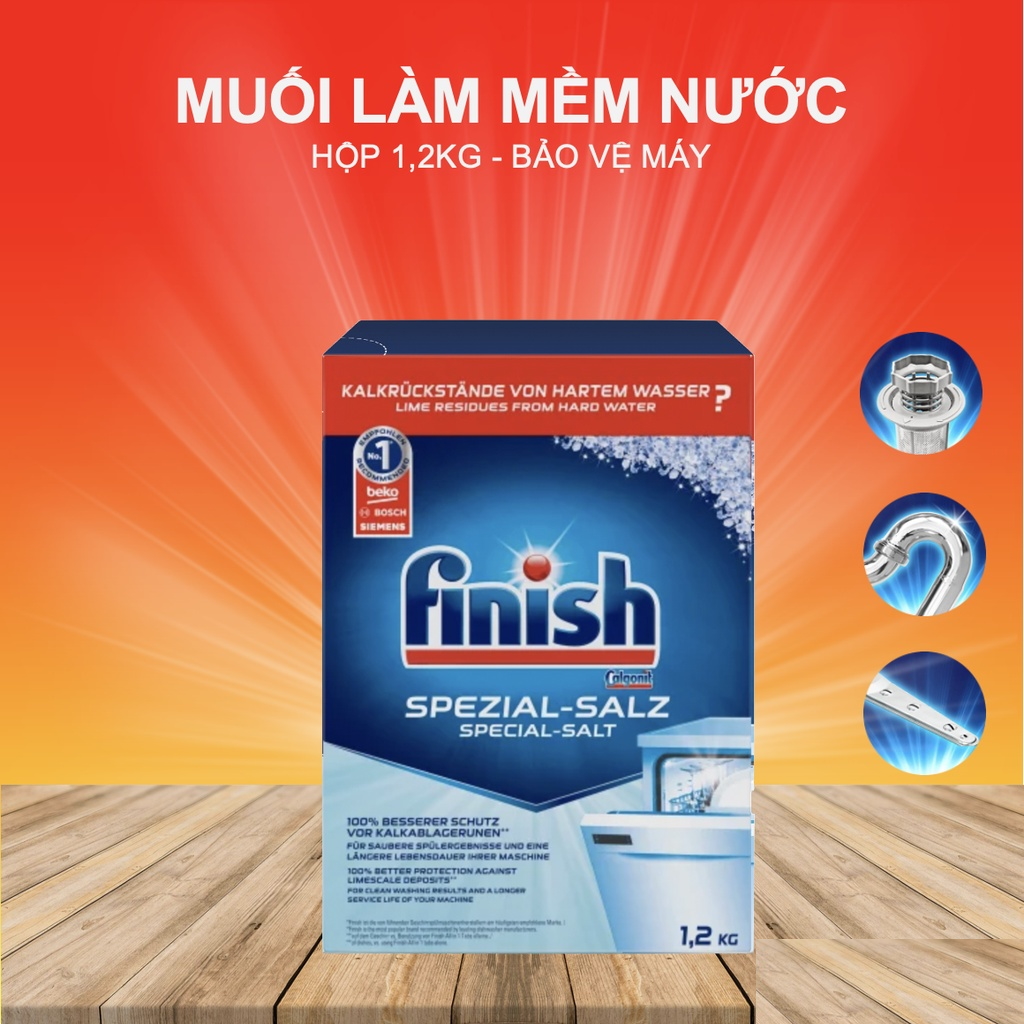 Muối rửa chén Finish Dishwasher Salt giúp làm mềm nước trong máy rửa chén của bạn. Nước máy thông thường chứa nhiều canxi, magie sẽ gây lên sự tích tụ cặn vôi trong máy rửa chén, đồng thời làm giảm tính năng của viên rửa chén, gây tắc vòi phun nước, ống dẫn và đặc biệt tạo ra các mảng bám trên chén đĩa, các đồ sành sứ, thủy tinh, inox và các dụng cụ nhà bếp của bạn.