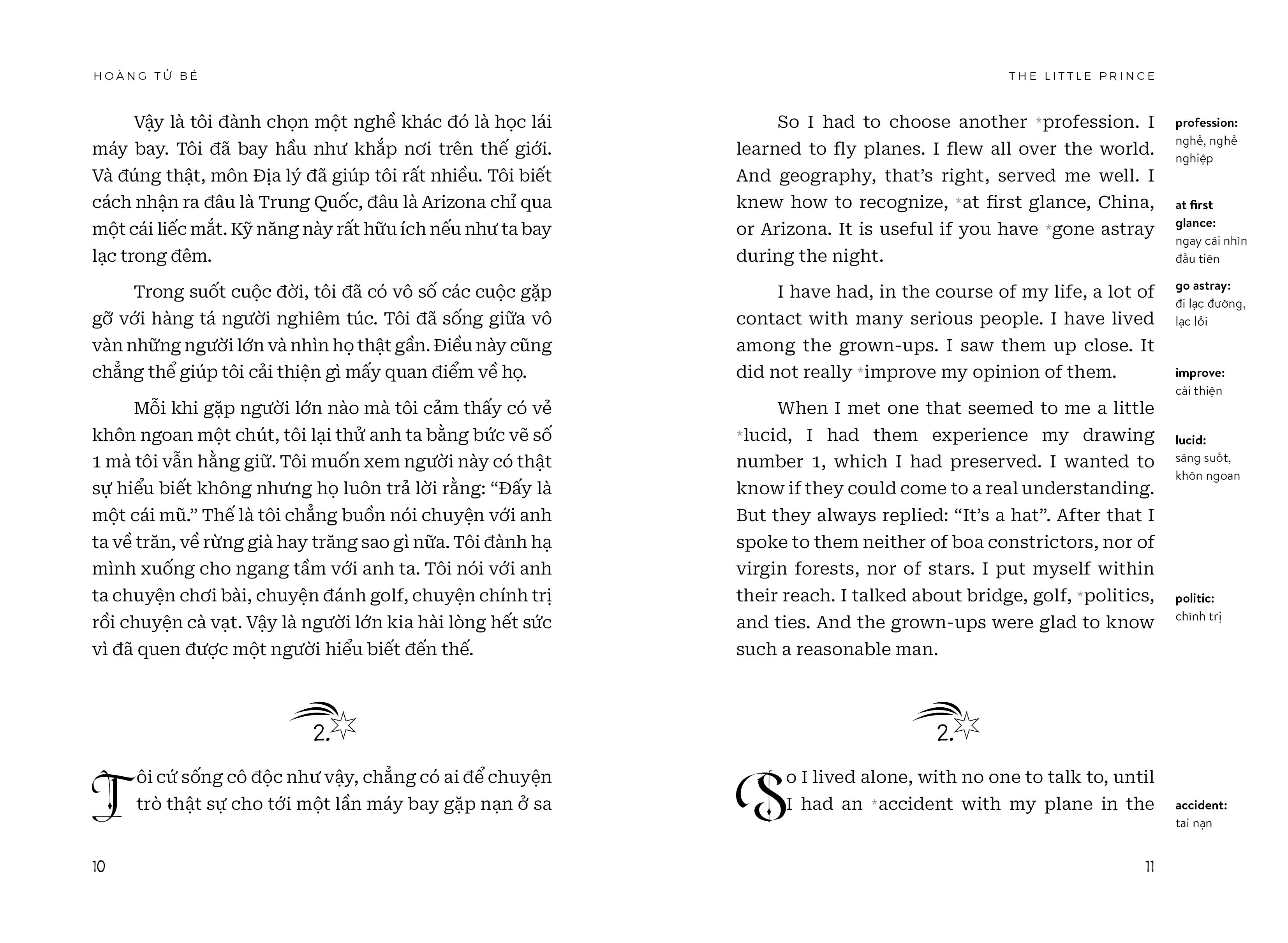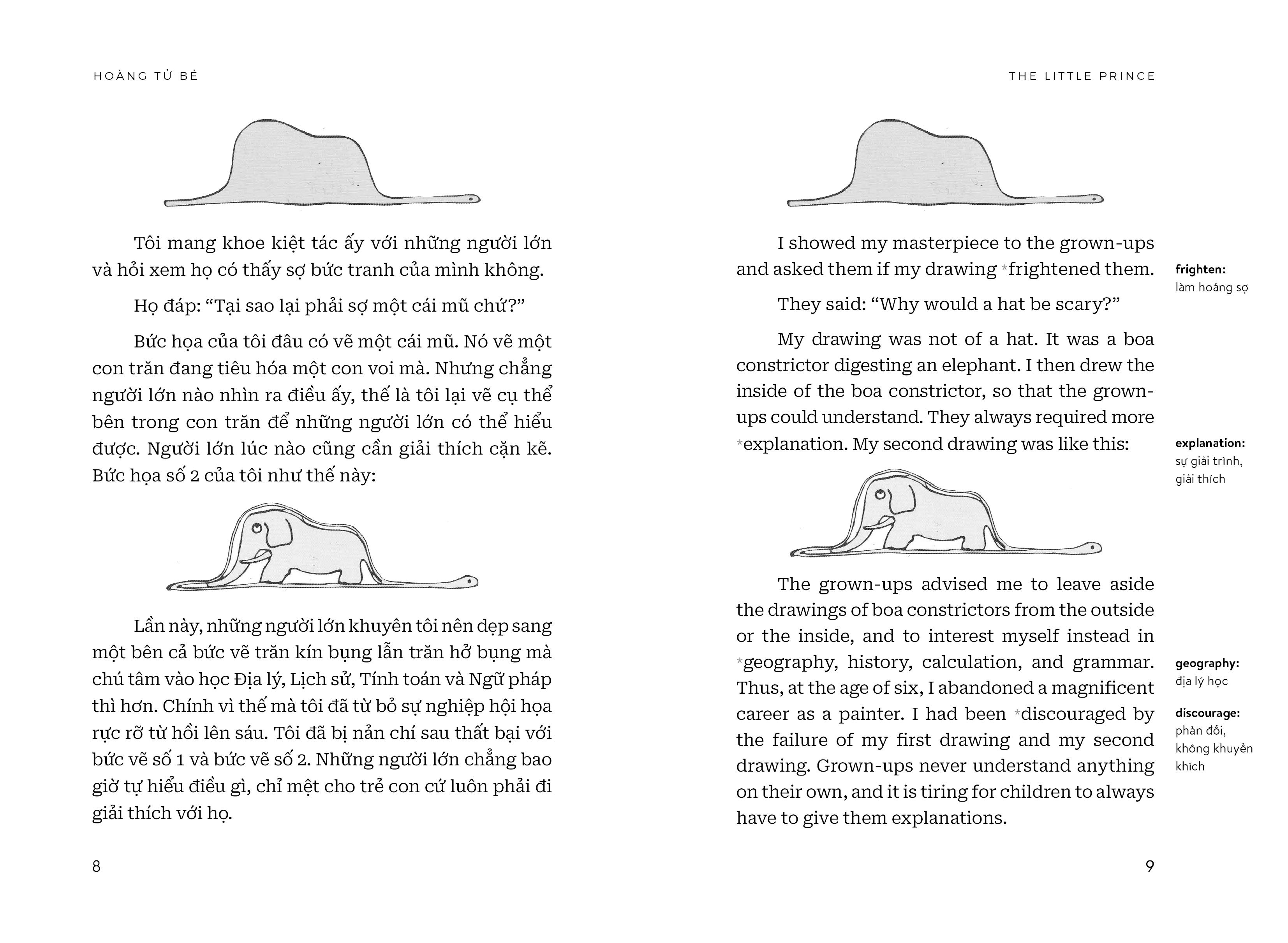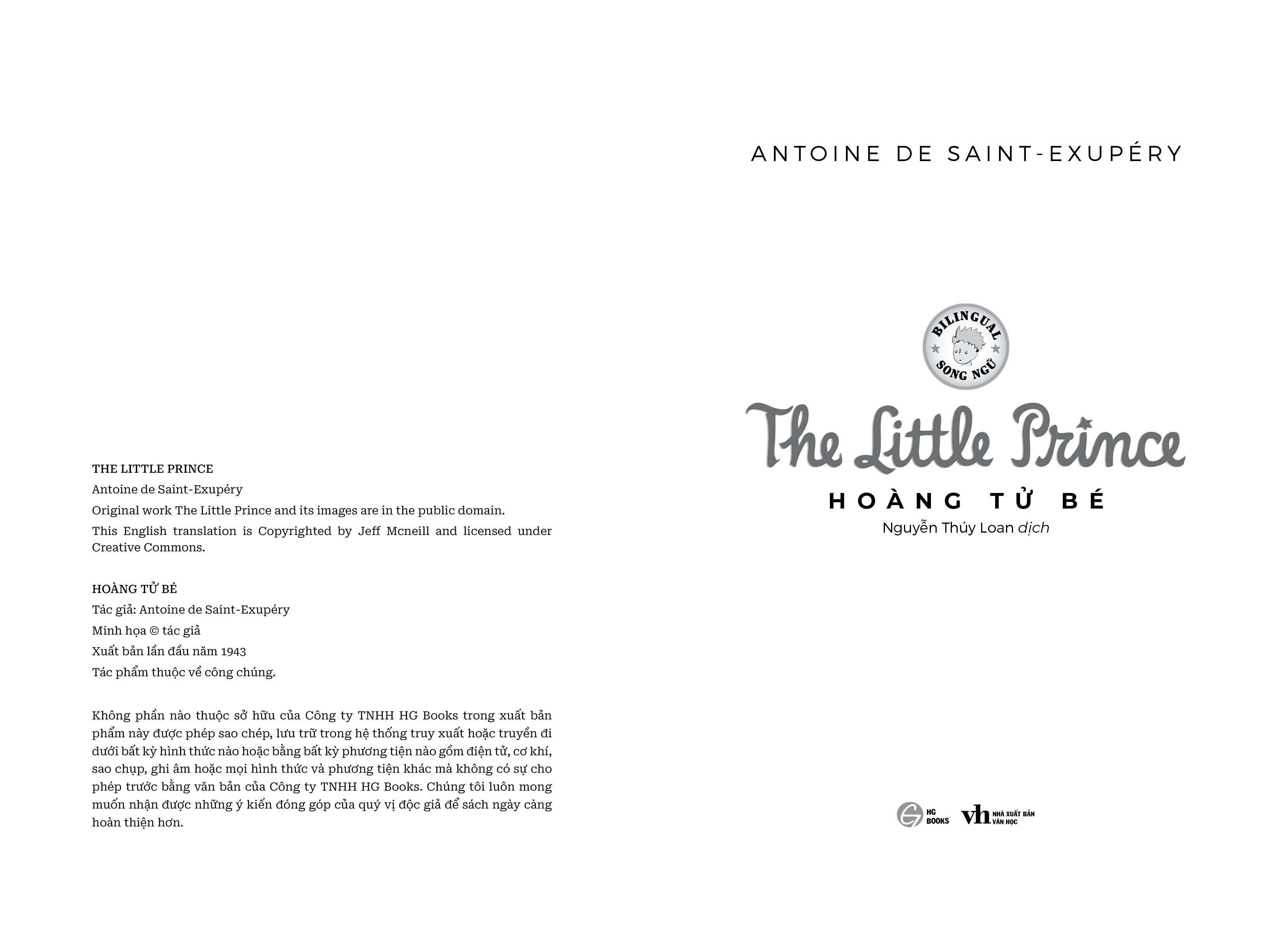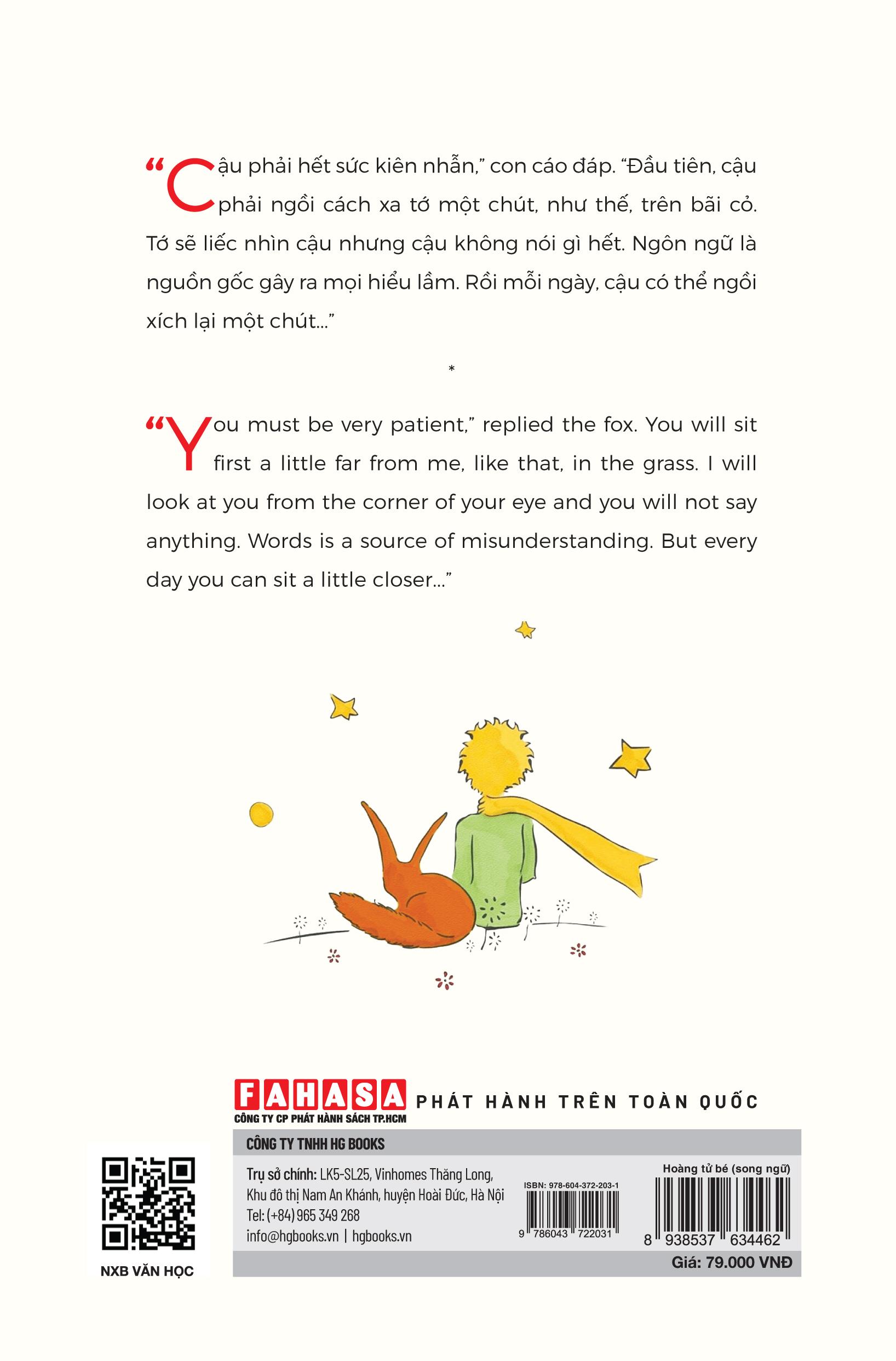 Đây là phiên bản Hoàng tử bé song ngữ Anh-Việt duy nhất có kết hợp chọn từ vựng tiếng Anh giúp các em nhỏ học tiếng Anh, giải trí, tăng vốn từ vựng với những đoạn hội thoại đậm chất văn học, nuôi dưỡng và rèn luyện trí thông m.ình cảm xúc (EQ) và cảm nhận tác phẩm kinh điển này bằng cả hai thứ tiếng.