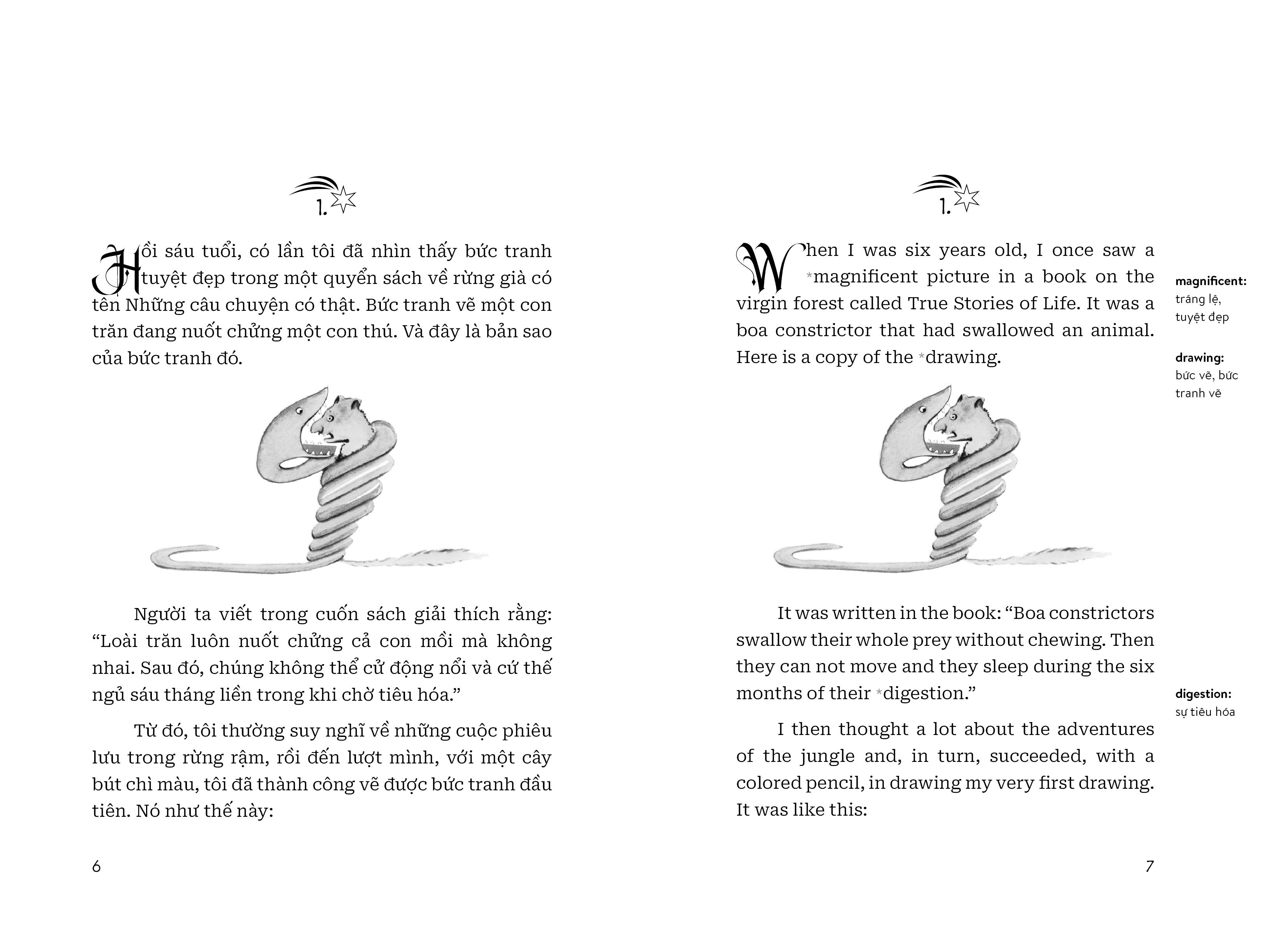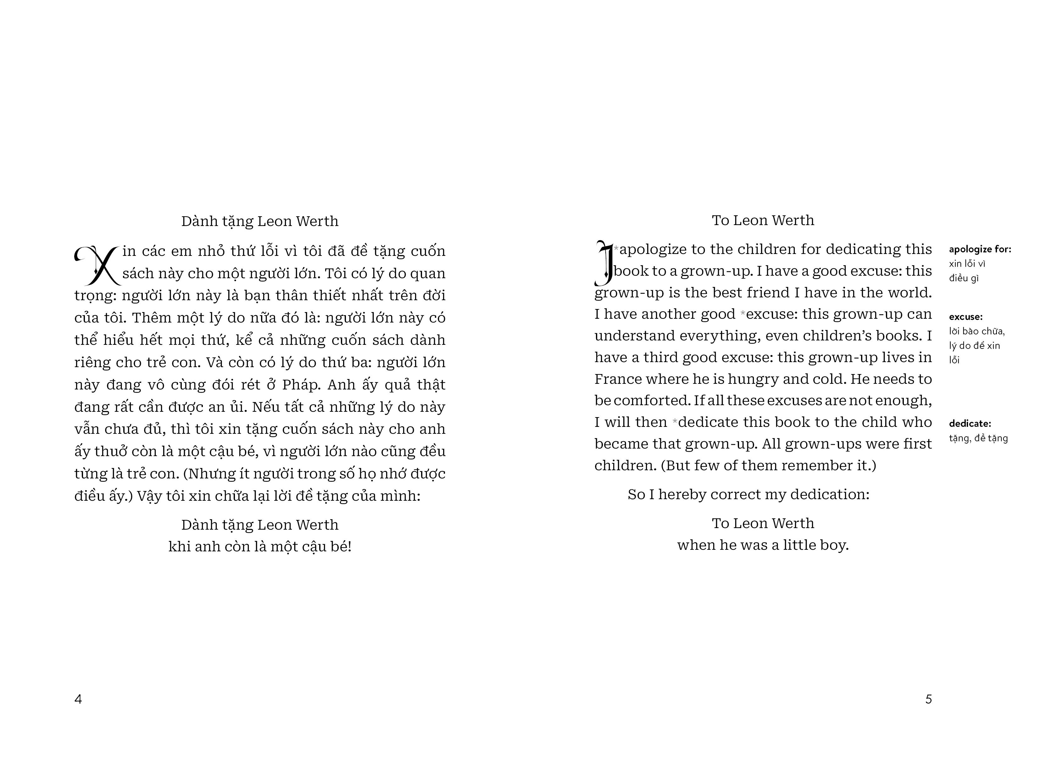 Trình bày song song hai ngôn ngữ giúp học tiếng Anh (hoặc người nước ngoài học tiếng Việt) một cách dễ dàng cùng phần ghi chú từ vựng vô cùng sáng tạo, độc đáo.