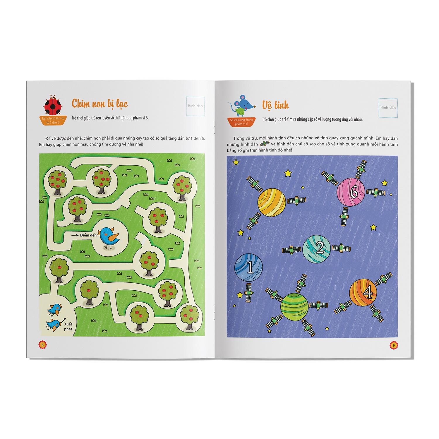 Điểm thú vị của bộ sách là những câu hỏi, bài tập được trình bày rất sống động, đầy màu sắc, sẽ kích thích được sự yêu thích, ham học hỏi của trẻ. Với những hình dán Tuyệt vời, Rất tốt, Rất thông minh, Đủ tiêu chuẩn, Cần cố gắng… để đánh giá từng bài tập, bố mẹ hãy khuyến khích, cổ vũ con mình học toán.