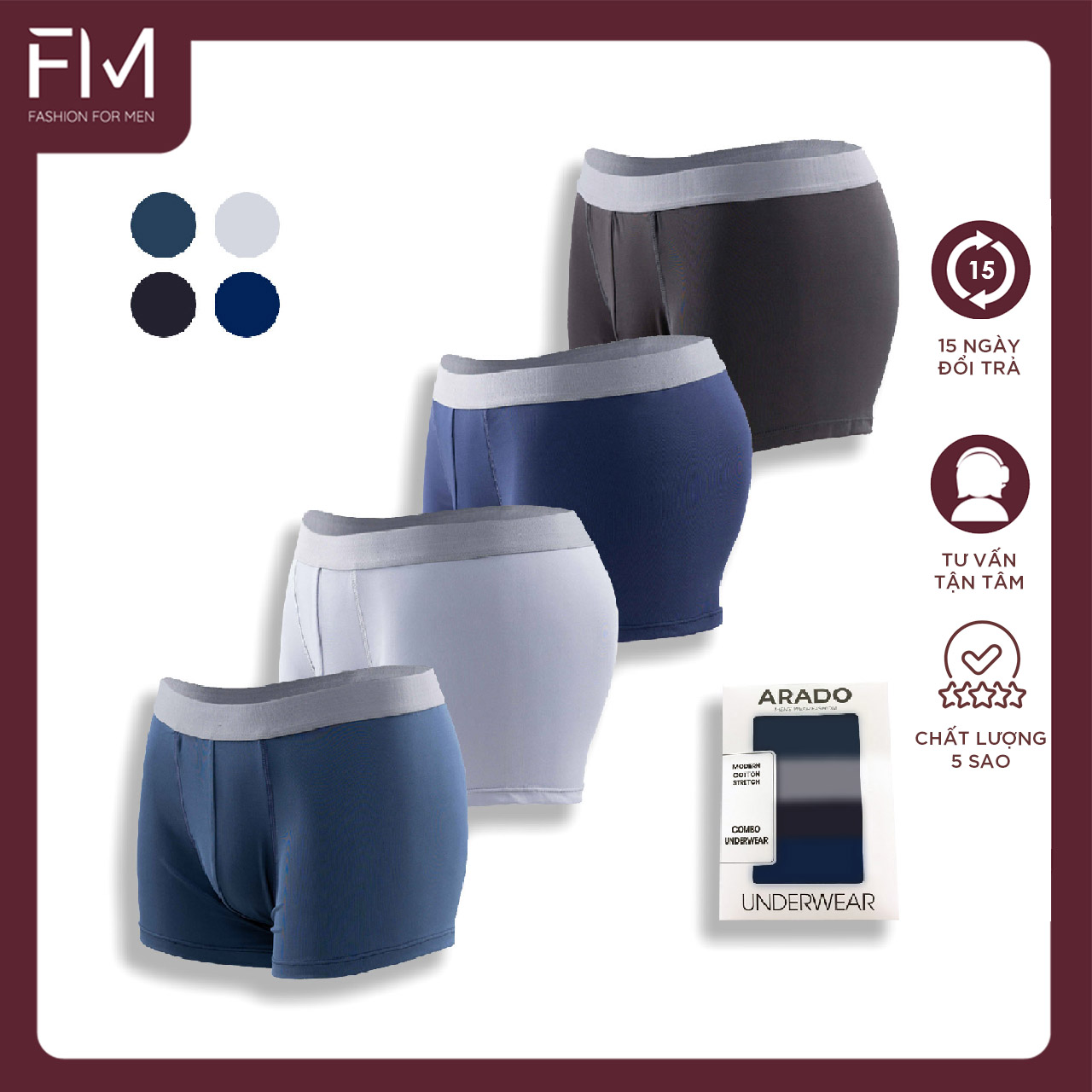 Thông số kỹ thuật Hộp 4 quần boxer nam thun lạnh, quần lót nam co dãn 4 chiều- Formen Shop- FMQS017