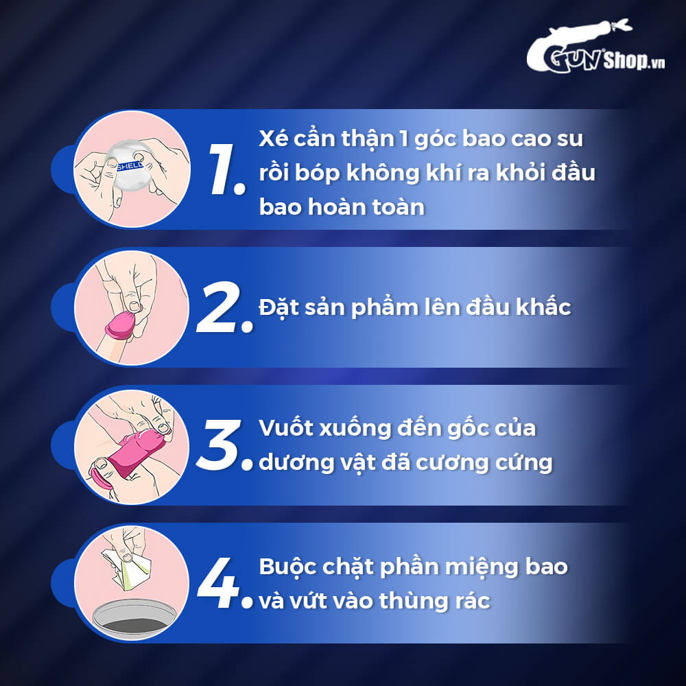 ✪ Cách dùng: Xé một góc trên vỏ bao, lấy “áo mưa” ra ngoài, bóp đầu bao để đuổi hết không khí ra ngoài. Đặt bi silicon vào bên trong đầu bao cao su, sau đó đặt “áo mưa” lên trên đầu khấc khi "cậu bé" đã "lên". Vuốt bao xuống đến gốc "cậu bé". Khi quan hệ xong, nhẹ nhàng rút bao ra khỏi "cậu bé" để tránh tinh dịch bị tràn ra ngoài. Thắt miệng bao cao su rồi đặt vào thùng rác.