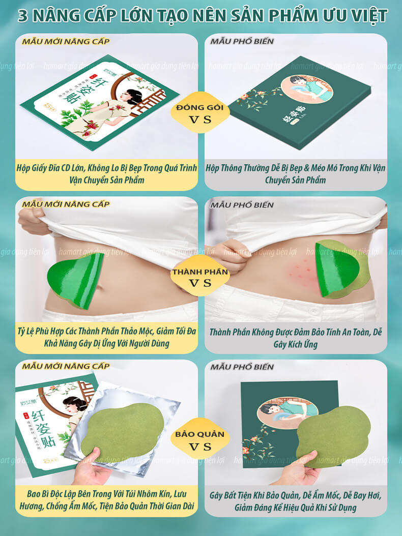 - Quy cách: Hộp 5 xanh miếng dán bụng size lớn - Hộp đỏ 12 miếng dán eo + Bao bì túi nhôm