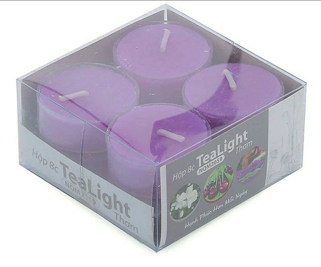 Hộp sản phẩm bao gồm 8 nến tealight thơm đế nhưa.