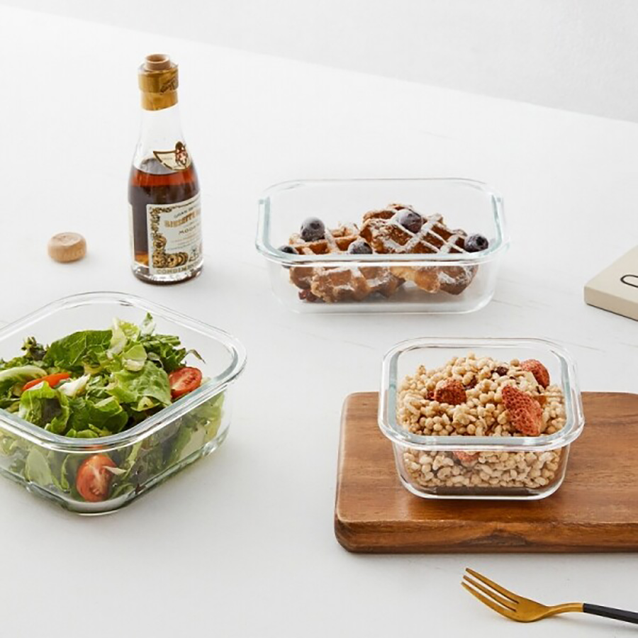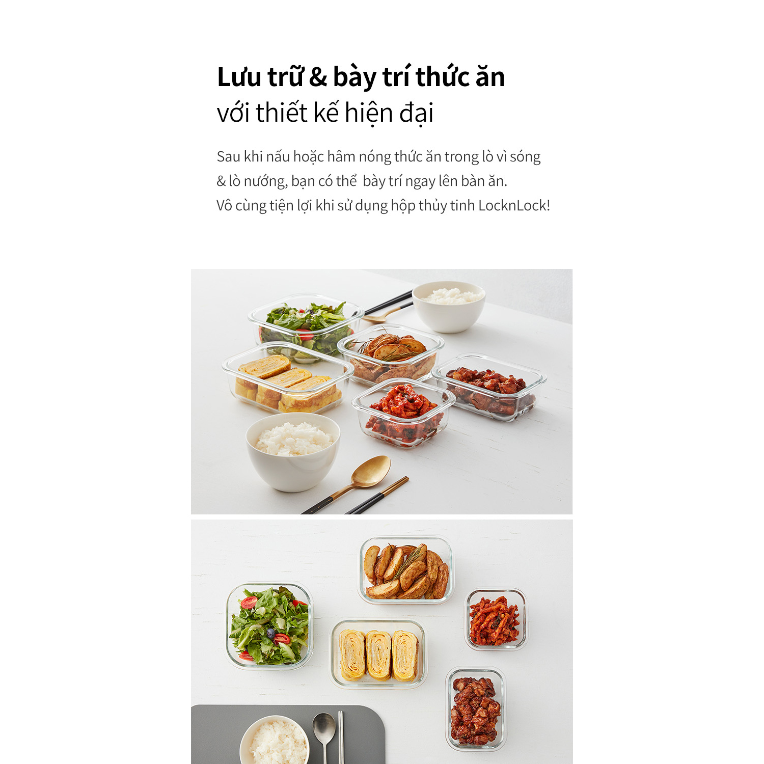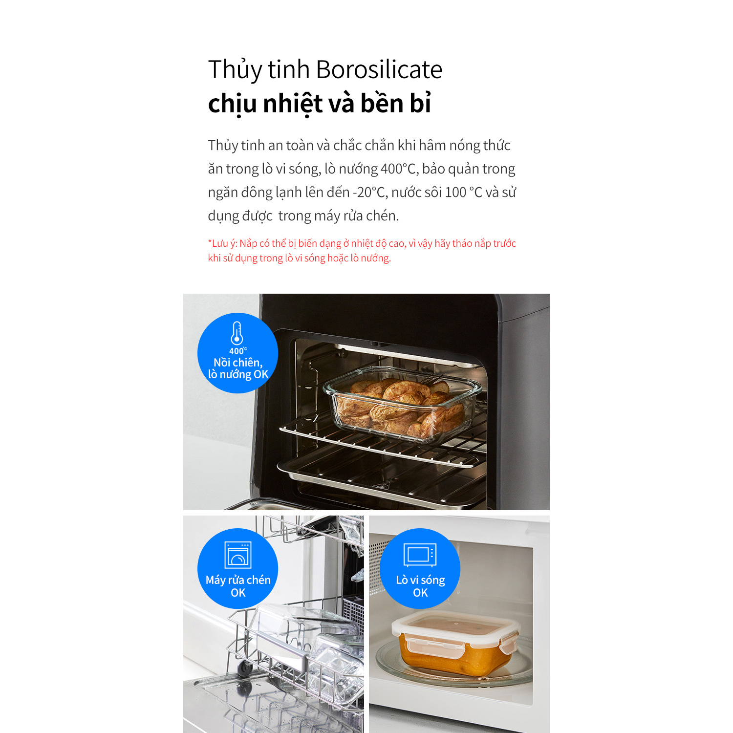 - Hộp bằng thủy tinh trong suốt giúp quan sát thực phẩm bên trong dễ dàng.