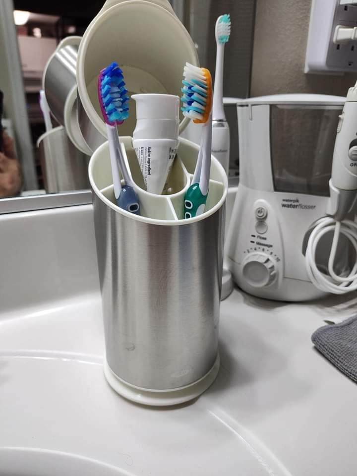 Sắp xếp bàn lavabo trong phòng tắm ngăn nắp với hộp đựng bàn chải đánh răng này của OXO. Nó được làm bằng thép không gỉ phù hợp với hầu hết mọi kiểu trang trí.