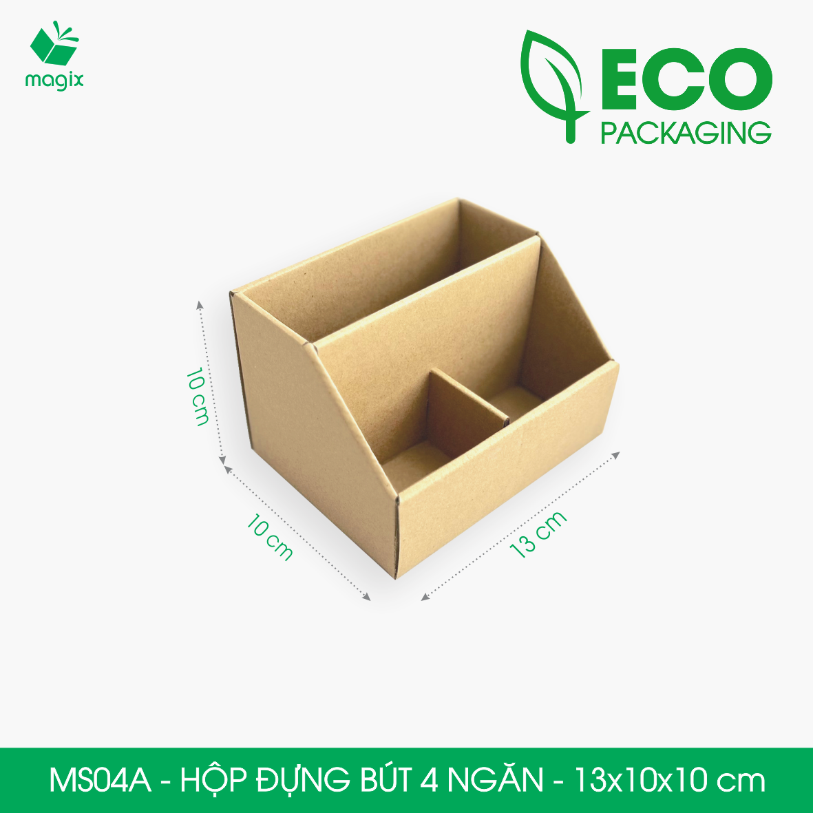 Chất liệu: MS04A - Hộp đựng bút 4 ngăn được làm từ giấy carton 3 lớp sóng E cao cấp, giúp cho sản phẩm gọn nhẹ nhưng vẫn đảm bảo độ bền cao.